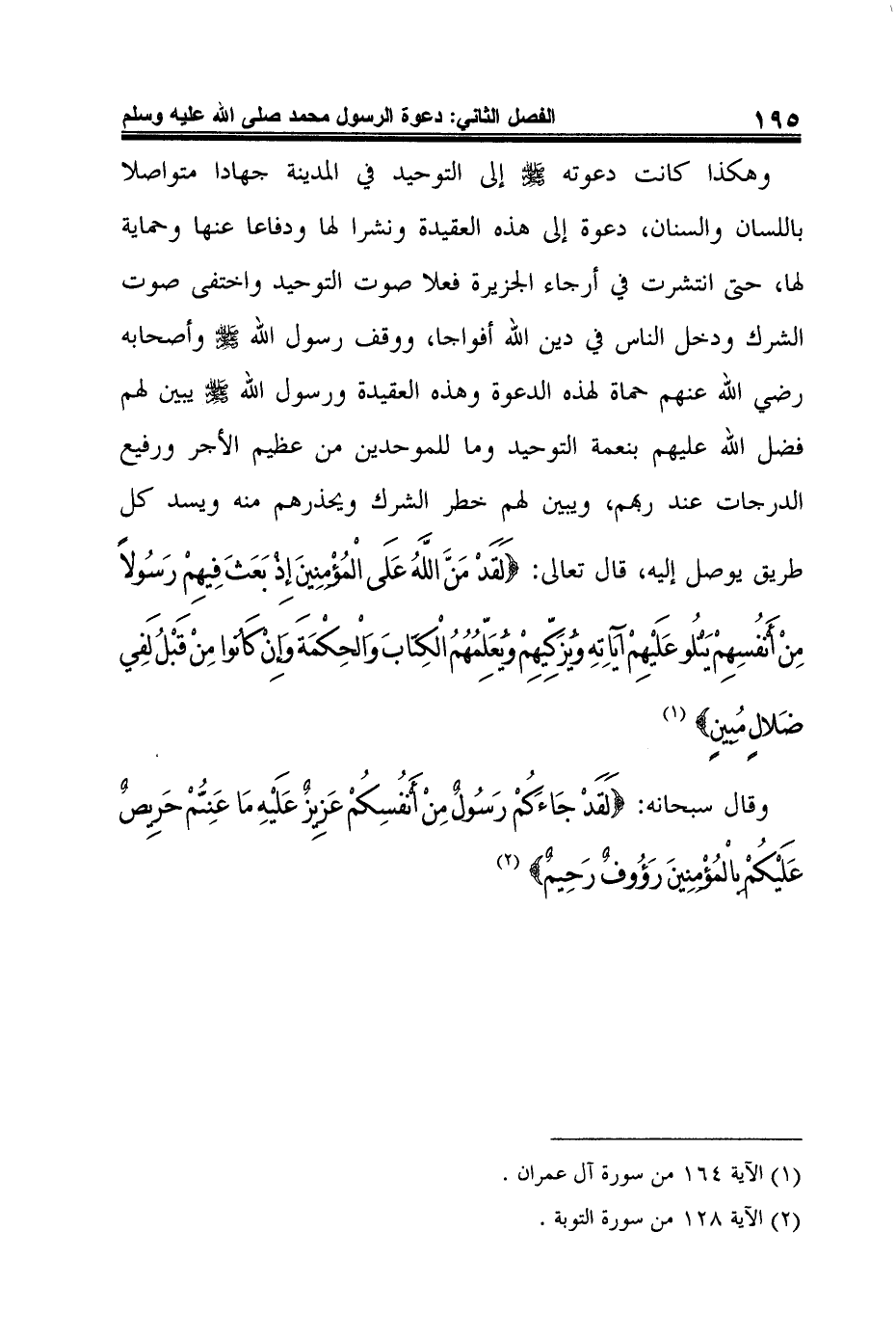 وهكذا كانت دعوته صلى الله عليه وسلم إلى التوحيد في المدينة جهادا متواصلا باللسان والسنان، دعوة إلى هذه العقيدة ونشرا لها ودفاعا عنها وحماية لها، حتى انتشرت في أرجاء الجزيرة فعلا صوت التوحيد واختفى صوت الشرك ودخل الناس في دين الله أفواجا، ووقف رسول الله صلى الله عليه وسلم وأصحابه رضي الله عنهم حماة لهذه الدعوة وهذه العقيدة ورسول الله صلى الله عليه وسلم يبين لهم فضل الله عليهم بنعمة التوحيد وما للموحدين من عظيم الأجر ورفيع الدرجات عند ربهم، ويبين لهم خطر الشرك ويحذرهم منه ويسد كل طريق يوصل إليه، قال تعالى: {لَقَدْ مَنَّ اللَّهُ عَلَى الْمُؤْمِنِينَ إِذْ بَعَثَ فِيهِمْ رَسُولاً مِنْ أَنْفُسِهِمْ يَتْلُو عَلَيْهِمْ آيَاتِهِ وَيُزَكِّيهِمْ وَيُعَلِّمُهُمُ الْكِتَابَ وَالْحِكْمَةَ وَإِنْ كَانُوا مِنْ قَبْلُ لَفِي ضَلالٍ مُبِينٍ} 1.