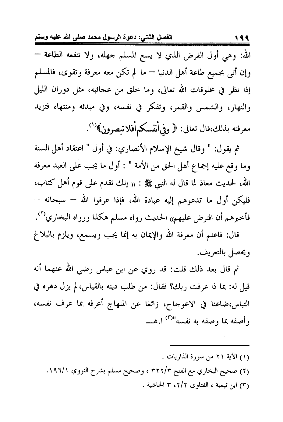 ثم يقول: "وقال شيخ الإسلام الأنصاري: في أول "اعتقاد أهل السنة وما وقع عليه إجماع أهل الحق من الأمة ": أول ما يجب على العبد معرفة الله، لحديث معاذ لما قال له النبي صلى الله عليه وسلم: "إنك تقدم على قوم أهل كتاب، فليكن أول ما تدعوهم إليه عبادة الله، فإذا عرفوا الله – سبحانه – فأخبرهم أن افترض عليهم" الحديث رواه مسلم هكذا ورواه البخاري2.