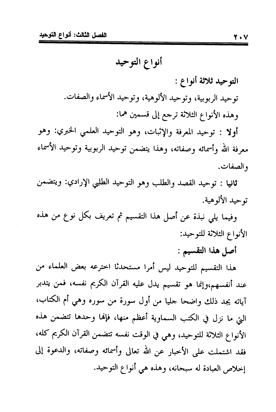 توحيد الربوبية، وتوحيد الألوهية، وتوحيد الأسماء والصفات.