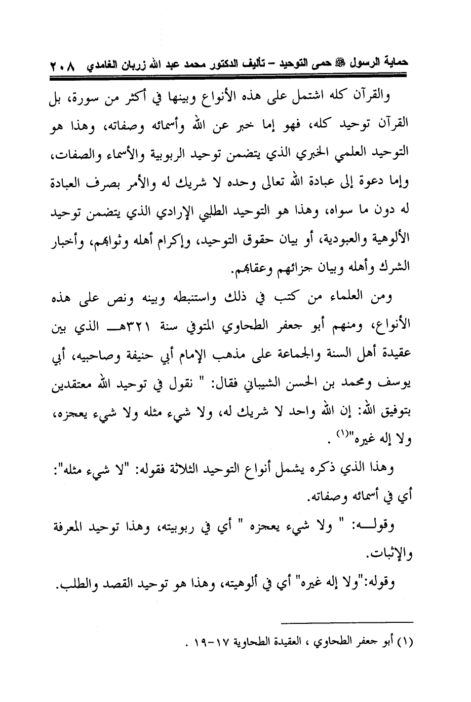 ومن العلماء من كتب في ذلك واستنبطه وبينه ونص على هذه الأنواع، ومنهم أبو جعفر الطحاوي المتوفي سنة 321هـ الذي بين عقيدة أهل السنة والجماعة على مذهب الإمام أبي حنيفة وصاحبيه، أبي يوسف ومحمد بن الحسن الشيباني فقال: "نقول في توحيد الله معتقدين بتوفيق الله: إن الله واحد لا شريك له، ولا شيء مثله ولا شيء يعجزه، ولا إله غيره"1.