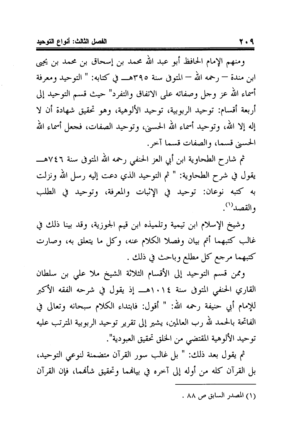 ومنهم الإمام الحافظ أبو عبد الله محمد بن إسحاق بن محمد بن يحيى ابن مندة – رحمه الله – المتوفى سنة 395هـ في كتابه: "التوحيد ومعرفة أسماء الله عز وجل وصفاته على الاتفاق والتفرد"حيث قسم التوحيد إلى أربعة أقسام: توحيد الربوبية، توحيد الألوهية، وهو تحقيق شهادة أن لا إله إلا الله، وتوحيد أسماء الله الحسنى، وتوحيد الصفات، فجعل أسماء الله الحسنى قسما، والصفات قسما آخر.
