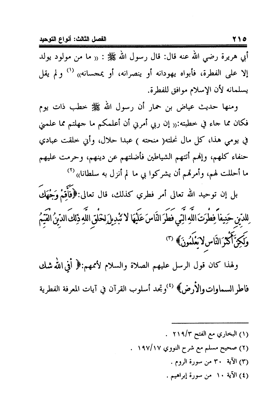 ولهذا كان قول الرسل عليهم الصلاة والسلام لأممهم: {أَفِي اللَّهِ شَكٌّ فَاطِرِ السَّمَاوَاتِ وَالأَرْضِ} 4 وتجد أسلوب القرآن في آيات المعرفة الفطرية