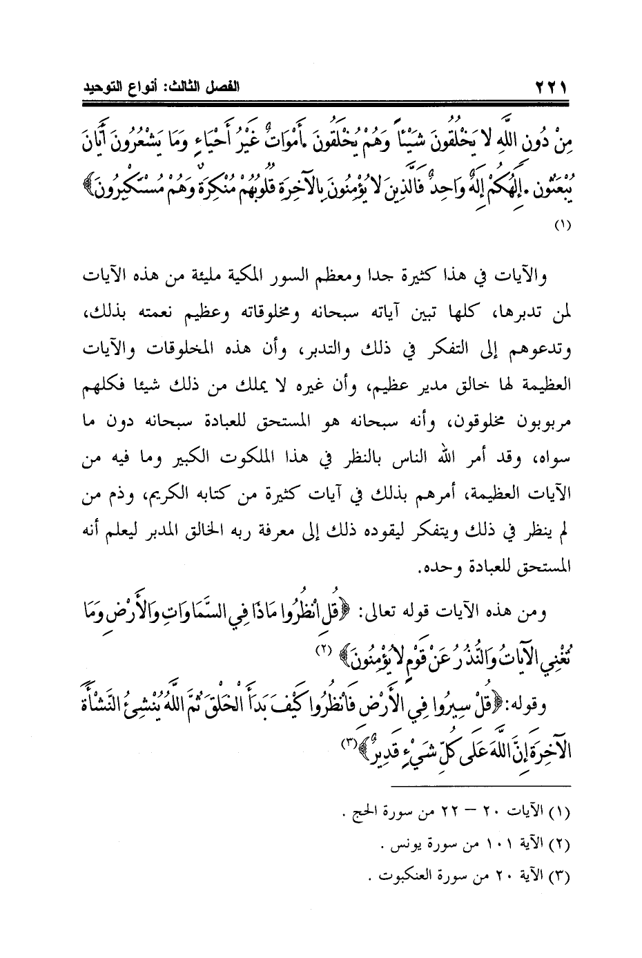 والآيات في هذا كثيرة جدا ومعظم السور المكية مليئة من هذه الآيات لمن تدبرها، كلها تبين آياته سبحانه ومخلوقاته وعظيم نعمته بذلك، وتدعوهم إلى التفكر في ذلك والتدبر، وأن هذه المخلوقات والآيات العظيمة لها خالق مدير عظيم، وأن غيره لا يملك من ذلك شيئا فكلهم مربوبون مخلوقون، وأنه سبحانه هو المستحق للعبادة سبحانه دون ما سواه، وقد أمر الله الناس بالنظر في هذا الملكوت الكبير وما فيه من الآيات العظيمة، أمرهم بذلك في آيات كثيرة من كتابه الكريم، وذم من لم ينظر في ذلك ويتفكر ليقوده ذلك إلى معرفة ربه الخالق المدبر ليعلم أنه المستحق للعبادة وحده.