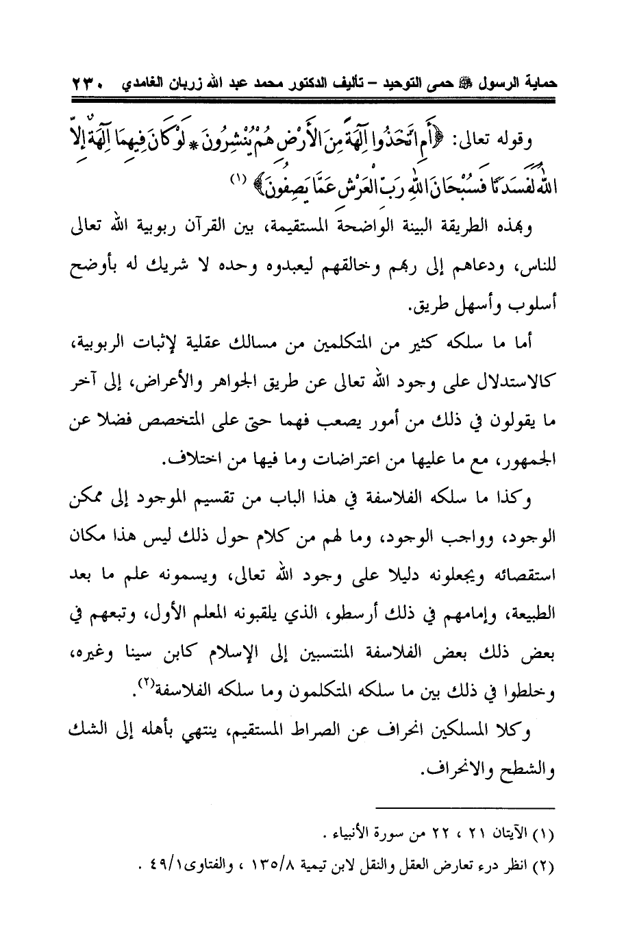 وقوله تعالى: {أَمِ اتَّخَذُوا آلِهَةً مِنَ الأَرْضِ هُمْ يُنْشِرُونَ لَوْ كَانَ فِيهِمَا آلِهَةٌ إِلاّ اللهُ لَفَسَدَتَا فَسُبْحَانَ اللهِ رَبِّ الْعَرْشِ عَمَّا يَصِفُونَ} 4. وبهذه الطريقة البينة الواضحة المستقيمة، بين القرآن ربوبية الله تعالى للناس، ودعاهم إلى ربهم وخالقهم ليعبدوه وحده لا شريك له بأوضح أسلوب وأسهل طريق.