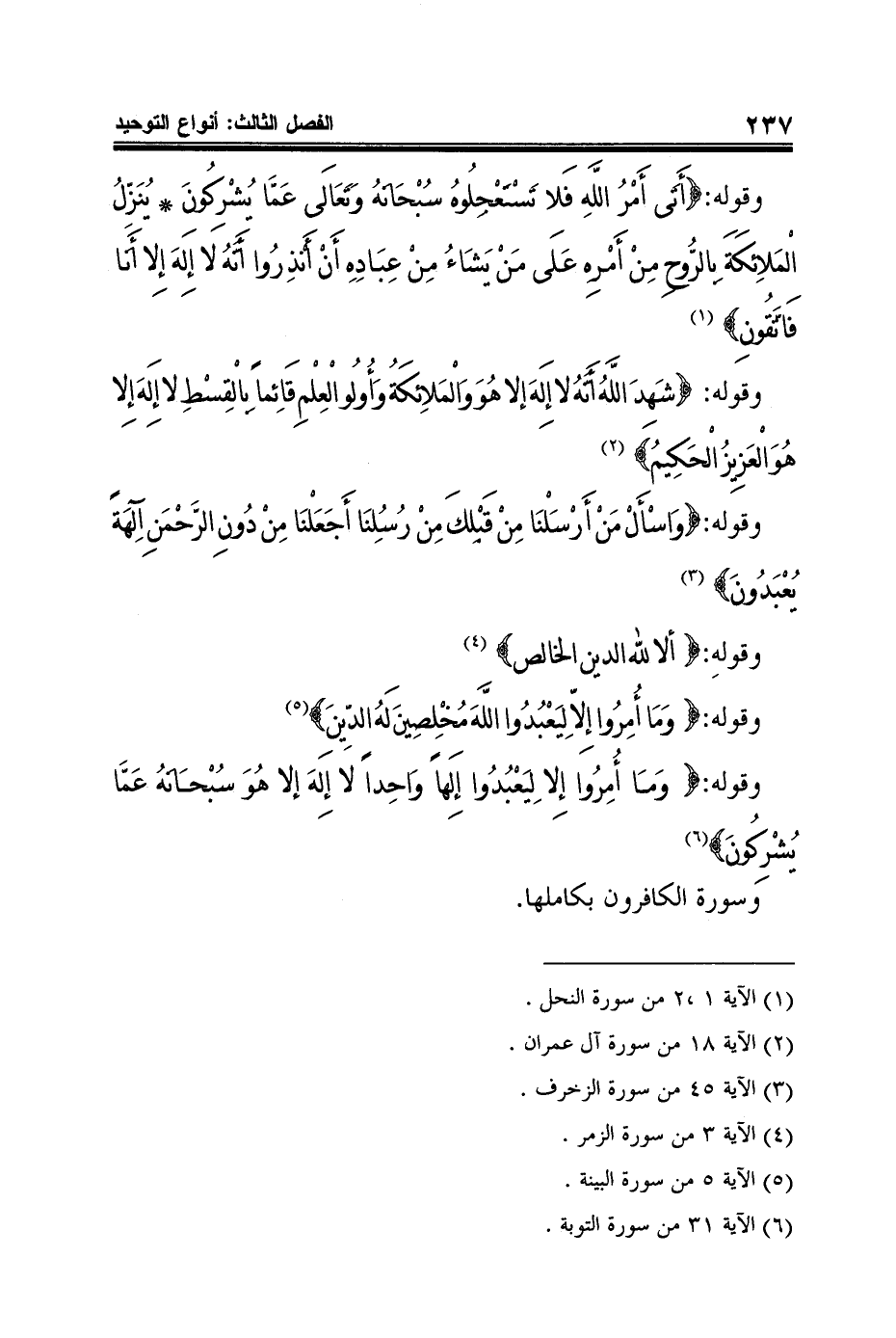 وقوله: {وَما أُمِرُوا إِلا لِيَعْبُدُوا إِلَهاً وَاحِداً لا إِلَهَ إلا هُوَ سُبْحانَهُ عَمَّا يُشْرِكُونَ} 6 وسورة الكافرون بكاملها.