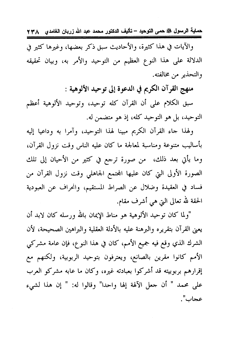 "ولما كان توحيد الألوهية هو مناط الإيمان بالله ورسله كان لابد أن يعنى القرآن بتقريره والبرهنة عليه بالأدلة العقلية والبراهين الصحيحة، لأن الشرك الذي وقع فيه جميع الأمم، كان في هذا النوع، فإن عامة مشركي الأمم كانوا مقرين بالصانع، ويعترفون بتوحيد الربوبية، ولكنهم مع إقرارهم بربوبيته قد أشركوا بعبادته غيره، وكان ما عابه مشركو العرب على محمد "أن جعل الآلهة إلها واحدا"وقالوا له: "إن هذا لشيء عجاب".