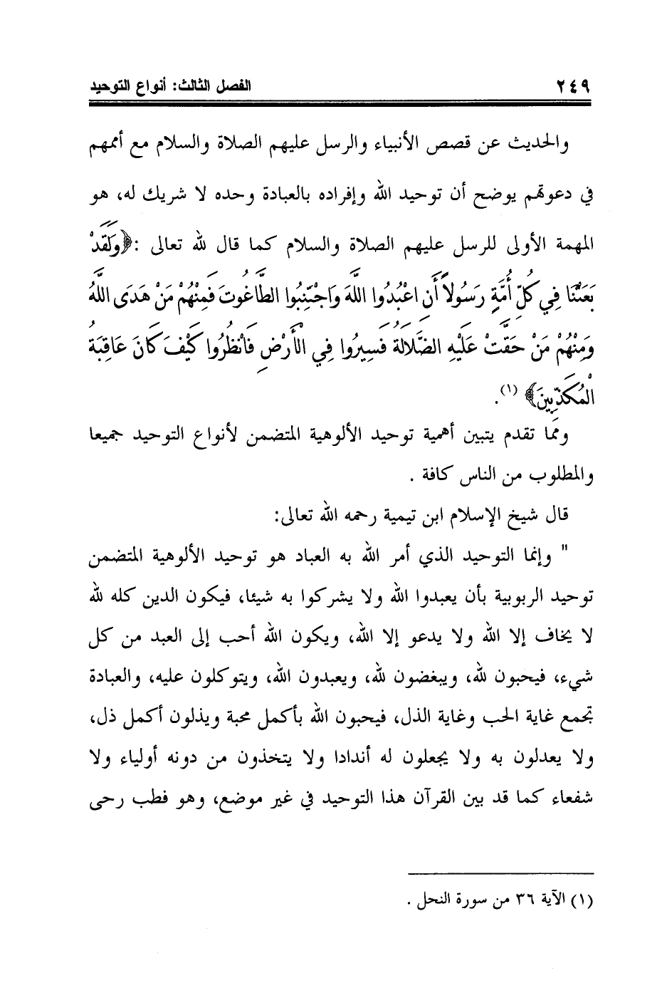"وإنما التوحيد الذي أمر الله به العباد هو توحيد الألوهية المتضمن توحيد الربوبية بأن يعبدوا الله ولا يشركوا به شيئا، فيكون الدين كله لله لا يخاف إلا الله ولا يدعو إلا الله، ويكون الله أحب إلى العبد من كل شيء، فيحبون لله، ويبغضون لله، ويعبدون الله، ويتوكلون عليه، والعبادة تجمع غاية الحب وغاية الذل، فيحبون الله بأكمل محبة ويذلون أكمل ذل، ولا يعدلون به ولا يجعلون له أندادا ولا يتخذون من دونه أولياء ولا شفعاء كما قد بين القرآن هذا التوحيد في غير موضع، وهو فطب رحى