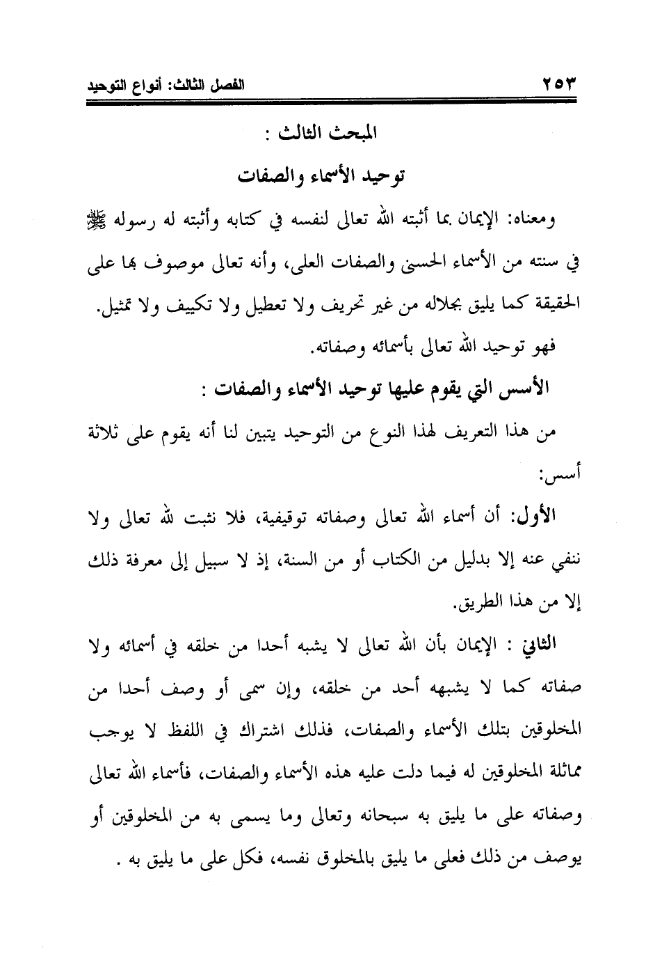 الثاني: الإيمان بأن الله تعالى لا يشبه أحدا من خلقه في أسمائه ولا صفاته كما لا يشبهه أحد من خلقه، وإن سمى أو وصف أحدا من المخلوقين بتلك الأسماء والصفات، فذلك اشتراك في اللفظ لا يوجب مماثلة المخلوقين له فيما دلت عليه هذه الأسماء والصفات، فأسماء الله تعالى وصفاته على ما يليق به سبحانه وتعالى وما يسمى به من المخلوقين أو يوصف من ذلك فعلى ما يليق بالمخلوق نفسه، فكل على ما يليق به.