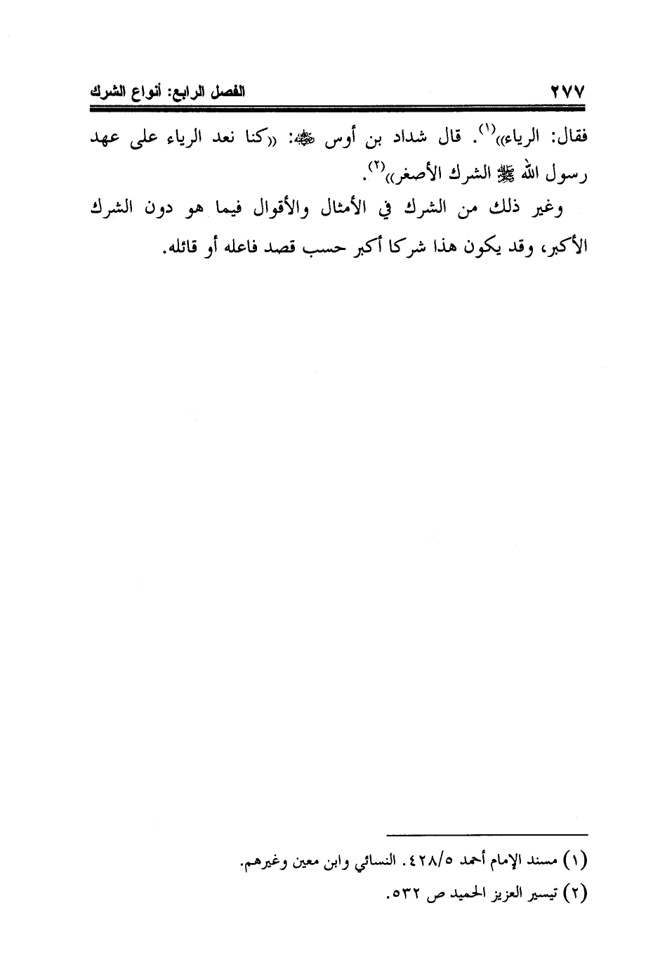 فقال: "الرياء"1. قال شداد بن أوس رضي الله عنه: "كنا نعد الرياء على عهد رسول الله صلى الله عليه وسلم الشرك الأصغر" 2.