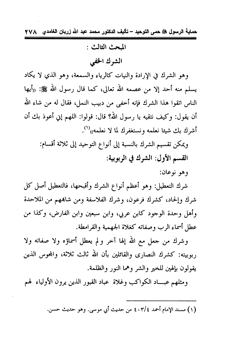 وهو الشرك في الإرادة والنيات كالرياء والسمعة، وهو الذي لا يكاد يسلم منه أحد إلا من عصمه الله تعالى، كما قال رسول الله صلى الله عليه وسلم: "أيها الناس اتقوا هذا الشرك فإنه أخفى من دبيب النمل"، فقال له من شاء الله أن يقول: وكيف نتقيه يا رسول الله؟ قال: قولوا: "اللهم إني أعوذ بك أن أشرك بك شيئا نعلمه ونستغفرك لما لا نعلمه" 1.