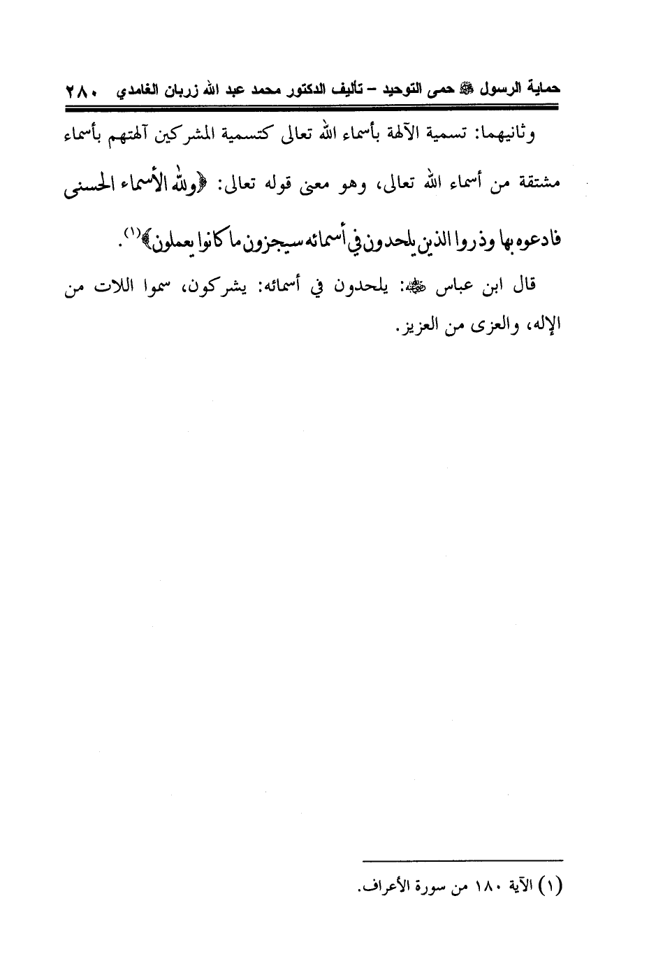 وثانيهما: تسمية الآلهة بأسماء الله تعالى كتسمية المشركين آلهتهم بأسماء مشتقة من أسماء الله تعالى، وهو معنى قوله تعالى: {وَلِلَّهِ الاسْمَاءُ الْحُسْنَى فَادْعُوهُ بِهَا وَذَرُوا الَّذِينَ يُلْحِدُونَ فِي أَسْمَائِهِ سَيُجْزَوْنَ مَا كَانُوا يَعْمَلُونَ} 1.