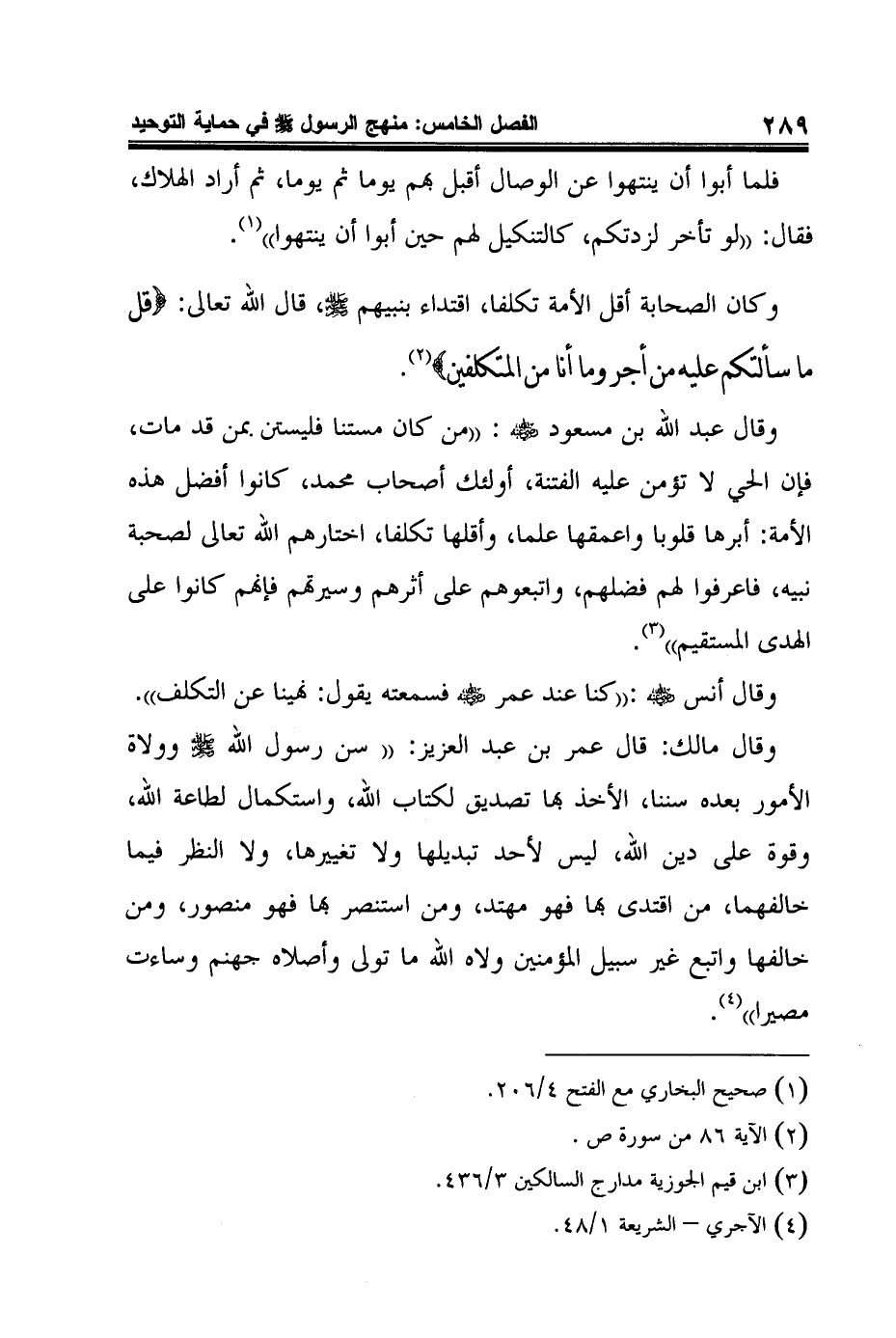 وكان الصحابة أقل الأمة تكلفا، اقتداء بنبيهم صلى الله عليه وسلم، قال الله تعالى: {قُلْ مَا أَسْأَلُكُمْ عَلَيْهِ مِنْ أَجْرٍ وَمَا أَنَا مِنَ الْمُتَكَلِّفِينَ} 2.