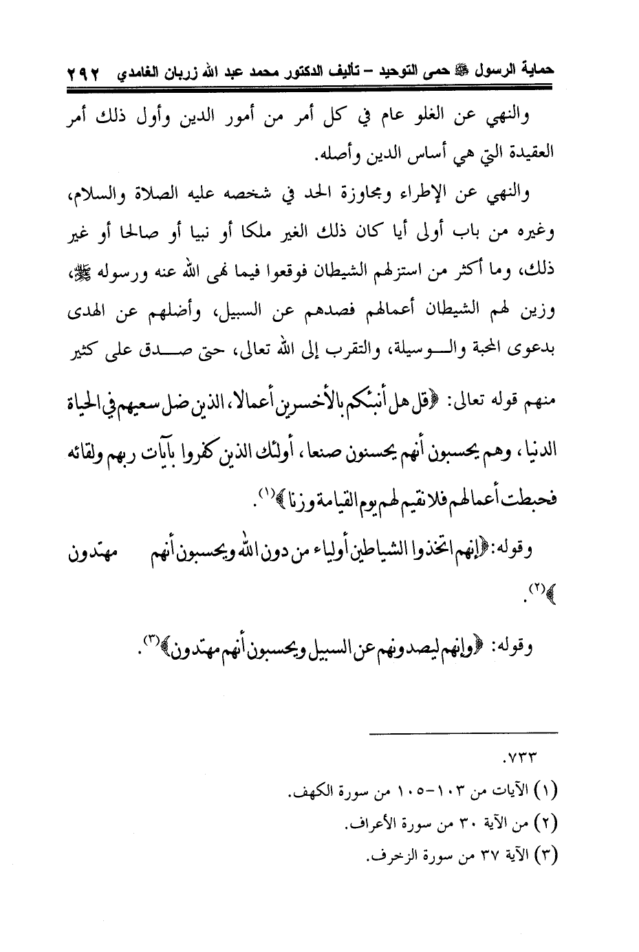 والنهي عن الإطراء ومجاوزة الحد في شخصه عليه الصلاة والسلام، وغيره من باب أولى أيا كان ذلك الغير ملكا أو نبيا أو صالحا أو غير ذلك، وما أكثر من استزلهم الشيطان فوقعوا فيما نهى الله عنه ورسوله صلى الله عليه وسلم، وزين لهم الشيطان أعمالهم فصدهم عن السبيل، وأضلهم عن الهدى بدعوى المحبة والوسيلة، والتقرب إلى الله تعالى، حتى صدق على كثير منهم قوله تعالى: {قُلْ هَلْ نُنَبِّئُكُمْ بِالأخْسَرِينَ أَعْمَالاً الَّذِينَ ضَلَّ سَعْيُهُمْ فِي الْحَيَاةِ الدُّنْيَا وَهُمْ يَحْسَبُونَ أَنَّهُمْ يُحْسِنُونَ صُنْعاً أُولَئِكَ الَّذِينَ كَفَرُوا بِآياتِ رَبِّهِمْ وَلِقَائِهِ فَحَبِطَتْ أَعْمَالُهُمْ فَلا نُقِيمُ لَهُمْ يَوْمَ الْقِيَامَةِ وَزْناً} 1.