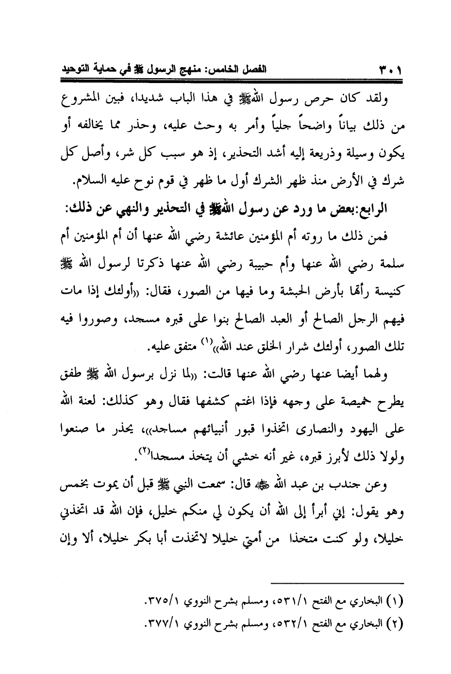 ولقد كان حرص رسول الله صلى الله عليه وسلم في هذا الباب شديدا، فبين المشروع من ذلك بياناً واضحاً جلياً وأمر به وحث عليه، وحذر مما يخالفه أو يكون وسيلة وذريعة إليه أشد التحذير، إذ هو سبب كل شر، وأصل كل شرك في الأرض منذ ظهر الشرك أول ما ظهر في قوم نوح عليه السلام.