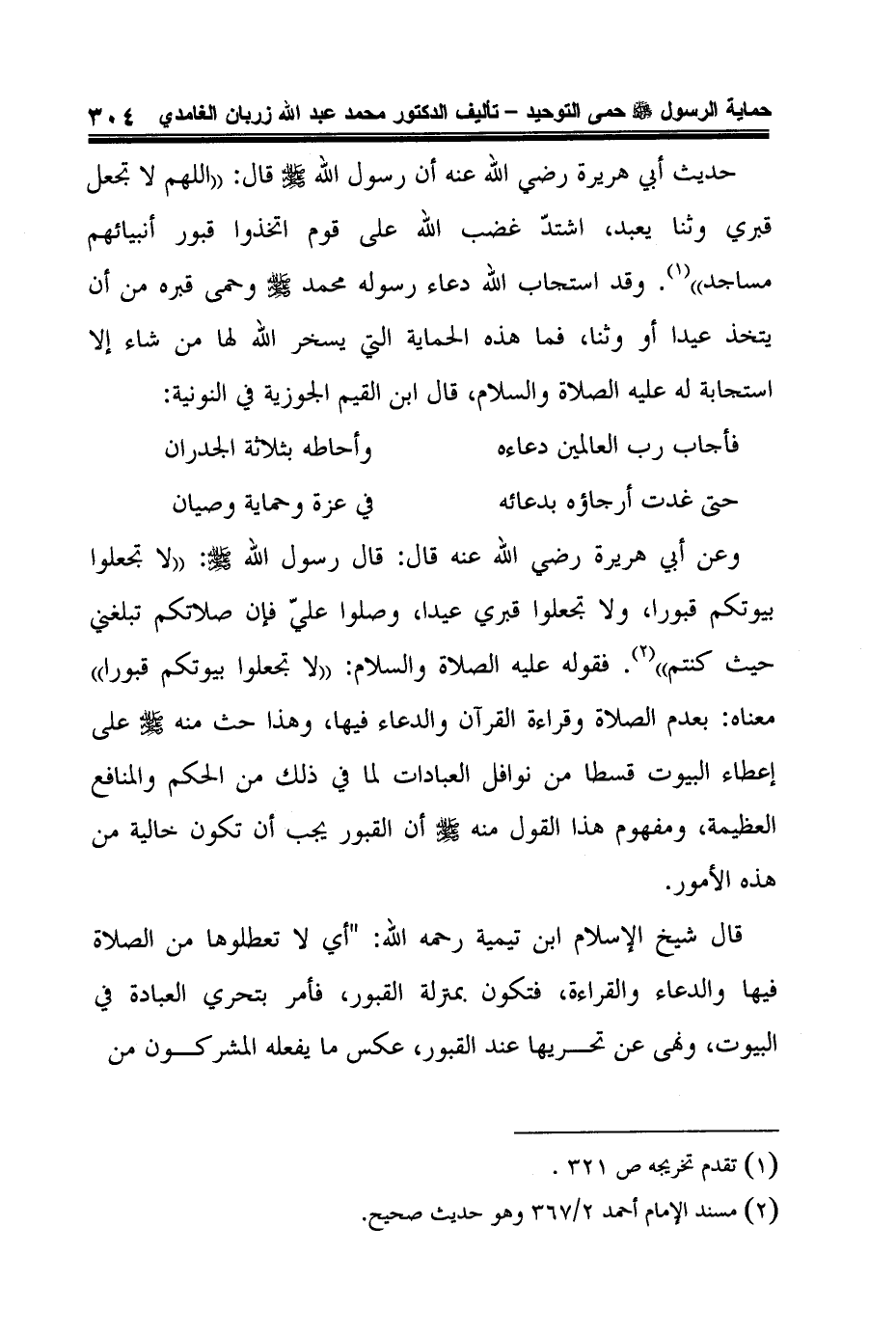 حديث أبي هريرة رضي الله عنه أن رسول الله صلى الله عليه وسلم قال: "اللهم لا تجعل قبري وثنا يعبد، اشتدّ غضب الله على قوم اتخذوا قبور أنبيائهم مساجد" 1. وقد استجاب الله دعاء رسوله محمد صلى الله عليه وسلم وحمى قبره من أن يتخذ عيدا أو وثنا، فما هذه الحماية التي يسخر الله لها من شاء إلا استجابة له عليه الصلاة والسلام، قال ابن القيم الجوزية في النونية: