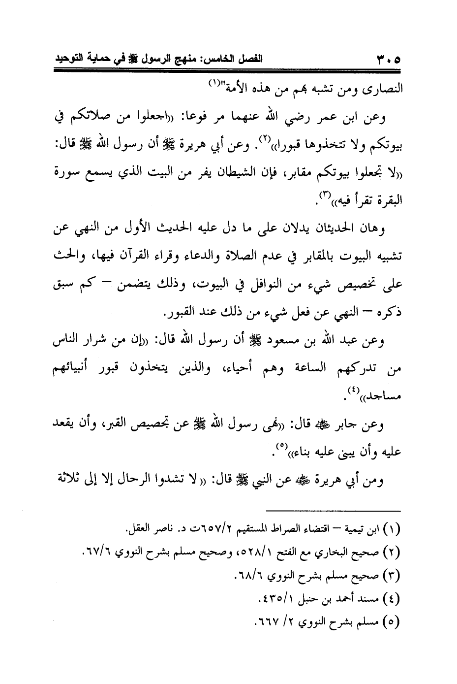 وهان الحديثان يدلان على ما دل عليه الحديث الأول من النهي عن تشبيه البيوت بالمقابر في عدم الصلاة والدعاء وقراء القرآن فيها، والحث على تخصيص شيء من النوافل في البيوت، وذلك يتضمن – كم سبق ذكره – النهي عن فعل شيء من ذلك عند القبور.