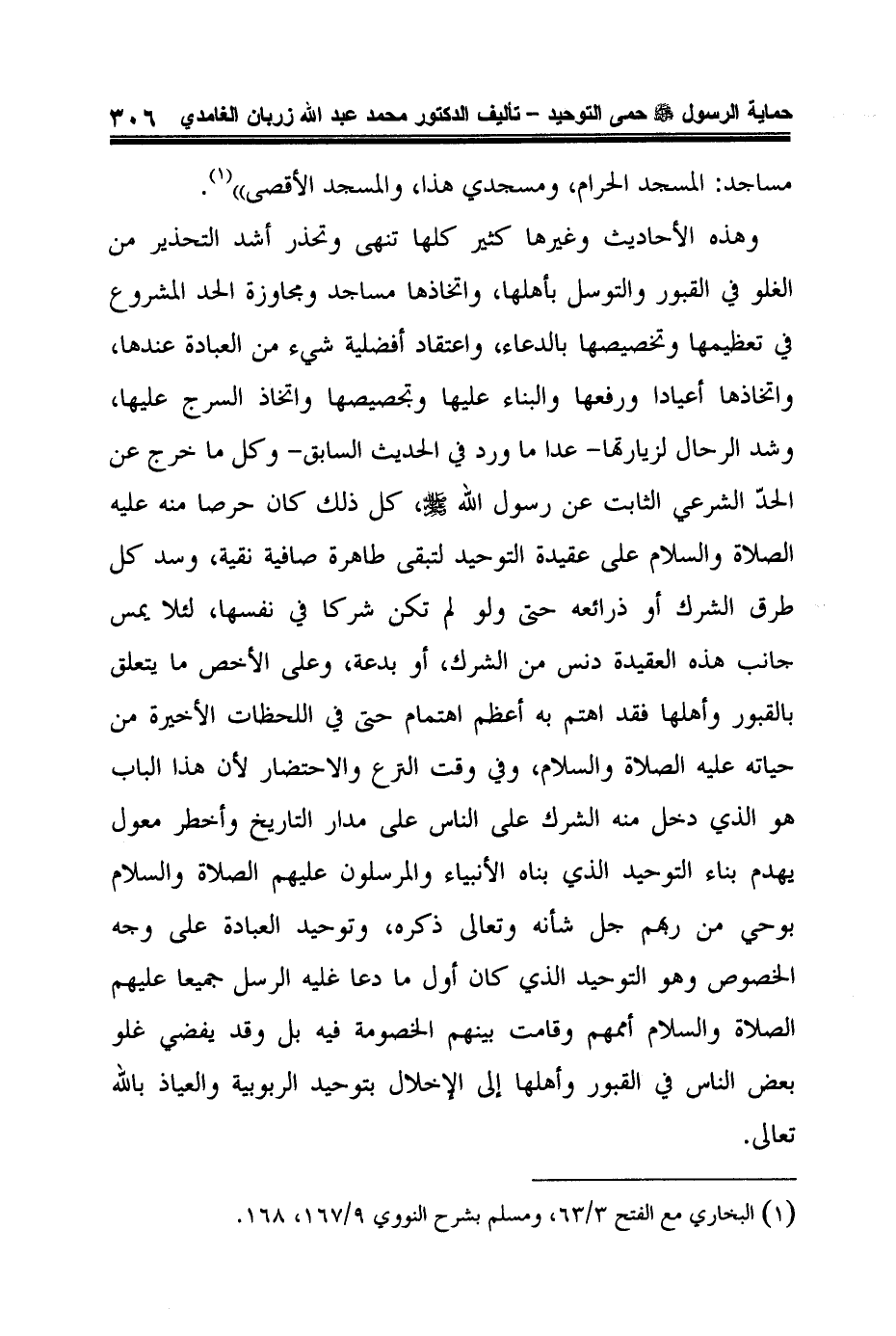 وهذه الأحاديث وغيرها كثير كلها تنهى وتحذر أشد التحذير من الغلو في القبور والتوسل بأهلها، واتخاذها مساجد ومجاوزة الحد المشروع في تعظيمها وتخصيصها بالدعاء، واعتقاد أفضلية شيء من العبادة عندها، واتخاذها أعيادا ورفعها والبناء عليها وتجصيصها واتخاذ السرج عليها، وشد الرحال لزيارتها- عدا ما ورد في الحديث السابق- وكل ما خرج عن الحدّ الشرعي الثابت عن رسول الله صلى الله عليه وسلم، كل ذلك كان حرصا منه عليه الصلاة والسلام على عقيدة التوحيد لتبقى طاهرة صافية نقية، وسد كل طرق الشرك أو ذرائعه حتى ولو لم تكن شركا في نفسها، لئلا يمس جانب هذه العقيدة دنس من الشرك، أو بدعة، وعلى الأخص ما يتعلق بالقبور وأهلها فقد اهتم به أعظم اهتمام حتى في اللحظات الأخيرة من حياته عليه الصلاة والسلام، وفي وقت النزع والاحتضار لأن هذا الباب هو الذي دخل منه الشرك على الناس على مدار التاريخ وأخطر معول يهدم بناء التوحيد الذي بناه الأنبياء والمرسلون عليهم الصلاة والسلام بوحي من ربهم جل شأنه وتعالى ذكره، وتوحيد العبادة على وجه الخصوص وهو التوحيد الذي كان أول ما دعا غليه الرسل جميعا عليهم الصلاة والسلام أممهم وقامت بينهم الخصومة فيه بل وقد يفضي غلو بعض الناس في القبور وأهلها إلى الإخلال بتوحيد الربوبية والعياذ بالله تعالى.