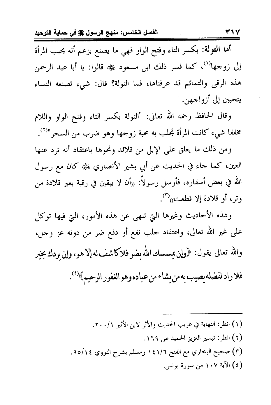 وقال الحافظ رحمه الله تعالى: "التولة بكسر التاء وفتح الواو واللام مخففا شيء كانت المرأة تجلب به محبة زوجها وهو ضرب من السحر"2.