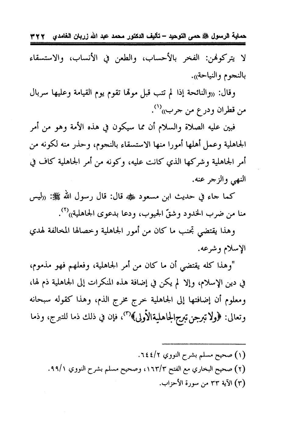 "وهذا كله يقتضي أن ما كان من أمر الجاهلية، وفعلهم فهو مذموم، في دين الإسلام، وإلا لم يكن في إضافة هذه المنكرات إلى الجاهلية ذم لها، ومعلوم أن إضافتها إلى الجاهلية خرج مخرج الذم، وهذا كقوله سبحانه وتعالى: {وَلا تَبَرَّجْنَ تَبَرُّجَ الْجَاهِلِيَّةِ الأولى} 3، فإن في ذلك ذما للتبرج، وذما