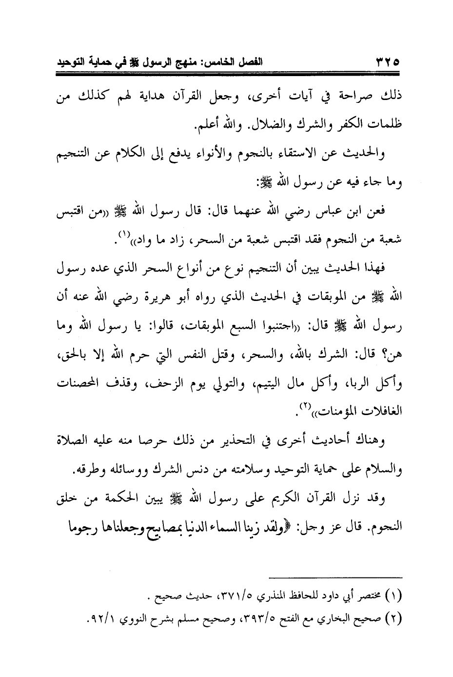 فهذا الحديث يبين أن التنجيم نوع من أنواع السحر الذي عده رسول الله صلى الله عليه وسلم من الموبقات في الحديث الذي رواه أبو هريرة رضي الله عنه أن رسول الله صلى الله عليه وسلم قال: "اجتنبوا السبع الموبقات "، قالوا: يا رسول الله وما هن؟ قال: "الشرك بالله، والسحر، وقتل النفس التي حرم الله إلا بالحق، وأكل الربا، وأكل مال اليتيم، والتولي يوم الزحف، وقذف المحصنات الغافلات المؤمنات" 2.