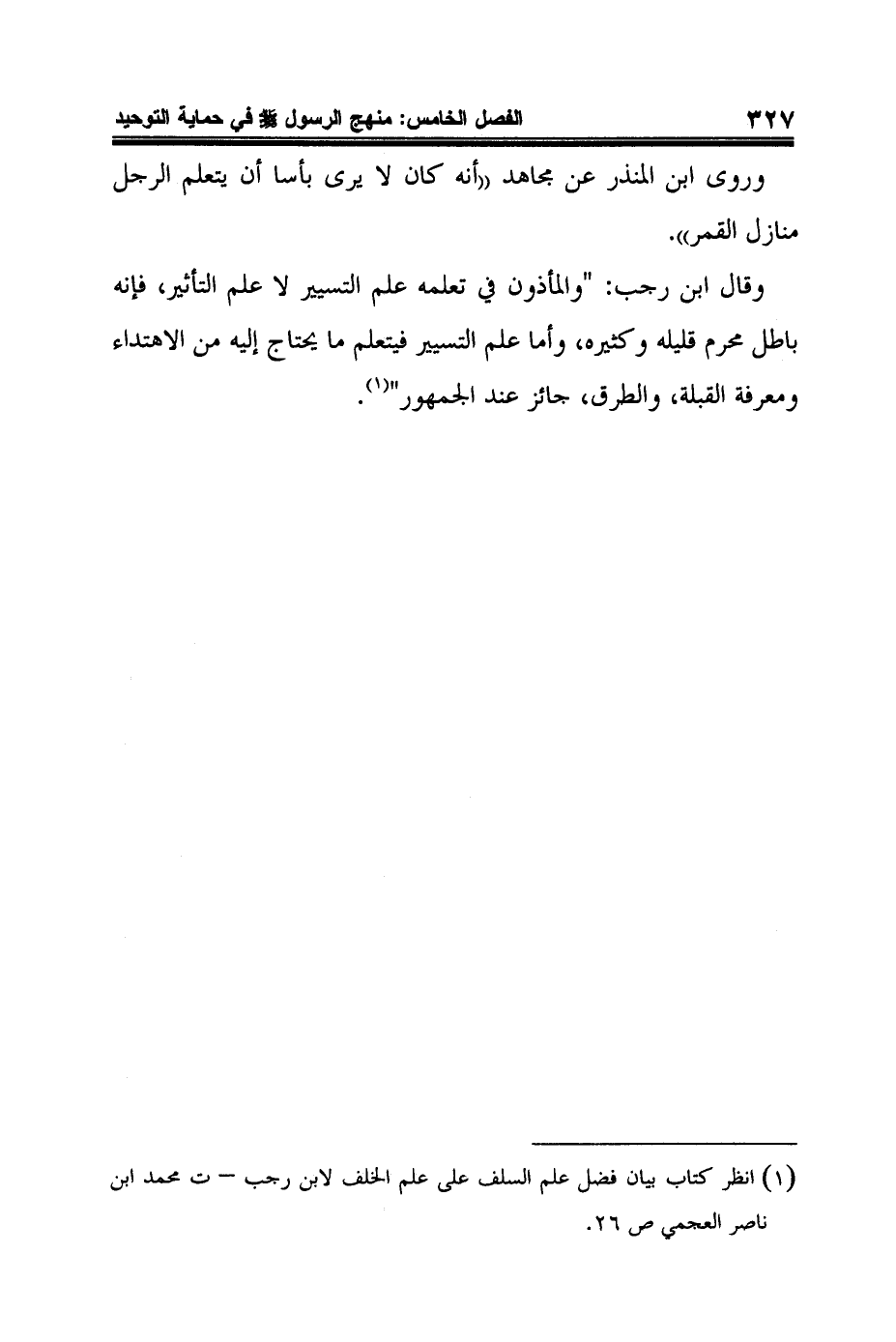وقال ابن رجب: "والمأذون في تعلمه علم التسيير لا علم التأثير، فإنه باطل محرم قليله وكثيره، وأما علم التسيير فيتعلم ما يحتاج إليه من الاهتداء ومعرفة القبلة، والطرق، جائز عند الجمهور"1.