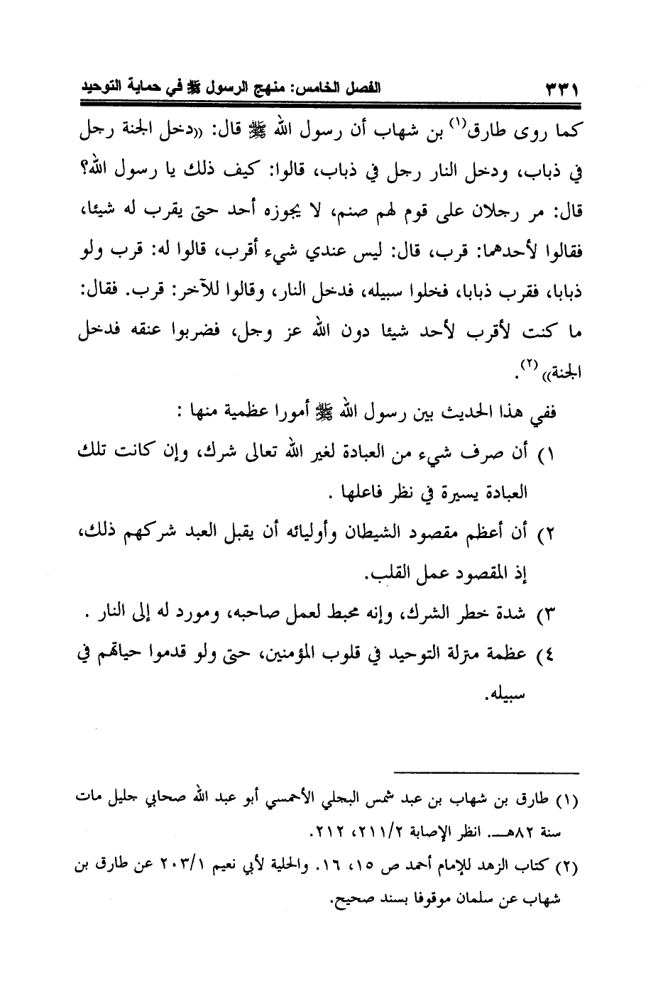 كما روى طارق1 بن شهاب أن رسول الله صلى الله عليه وسلم قال: "دخل الجنة رجل في ذباب، ودخل النار رجل في ذباب"، قالوا: كيف ذلك يا رسول الله؟ قال: "مر رجلان على قوم لهم صنم، لا يجوزه أحد حتى يقرب له شيئا، فقالوا لأحدهما: قرب، قال: ليس عندي شيء أقرب، قالوا له: قرب ولو ذبابا، فقرب ذبابا، فخلوا سبيله، فدخل النار، وقالوا للآخر: قرب. فقال: ما كنت لأقرب لأحد شيئا دون الله عز وجل، فضربوا عنقه فدخل الجنة" 2.