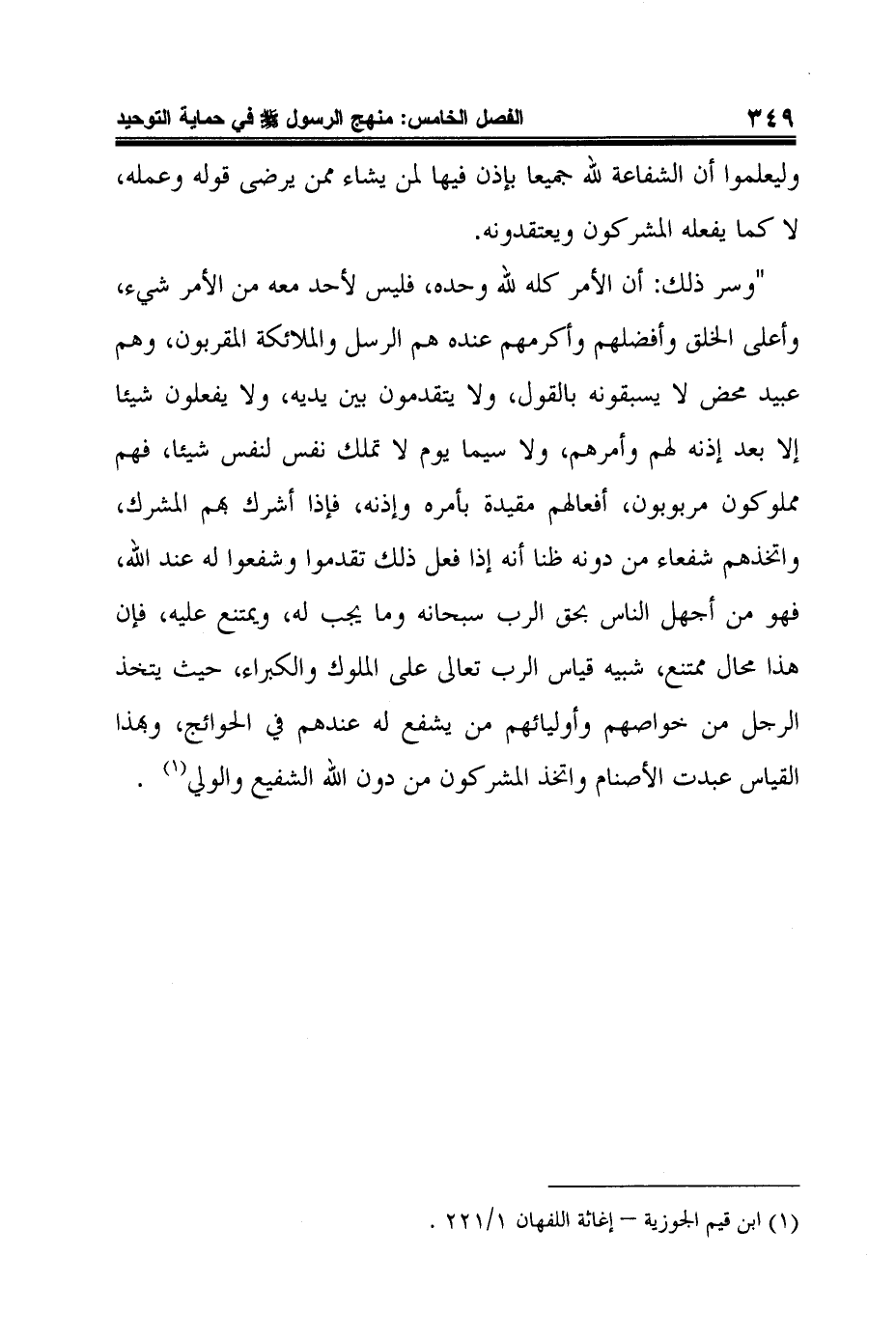 "وسر ذلك: أن الأمر كله لله وحده، فليس لأحد معه من الأمر شيء، وأعلى الخلق وأفضلهم وأكرمهم عنده هم الرسل والملائكة المقربون، وهم عبيد محض لا يسبقونه بالقول، ولا يتقدمون بين يديه، ولا يفعلون شيئا إلا بعد إذنه لهم وأمرهم، ولا سيما يوم لا تملك نفس لنفس شيئا، فهم مملوكون مربوبون، أفعالهم مقيدة بأمره وإذنه، فإذا أشرك بهم المشرك، واتخذهم شفعاء من دونه ظنا أنه إذا فعل ذلك تقدموا وشفعوا له عند الله، فهو من أجهل الناس بحق الرب سبحانه وما يجب له، ويمتنع عليه، فإن هذا محال ممتنع، شبيه قياس الرب تعالى على الملوك والكبراء، حيث يتخذ الرجل من خواصهم وأوليائهم من يشفع له عندهم في الحوائج، وبهذا القياس عبدت الأصنام واتخذ المشركون من دون الله الشفيع والولي1.