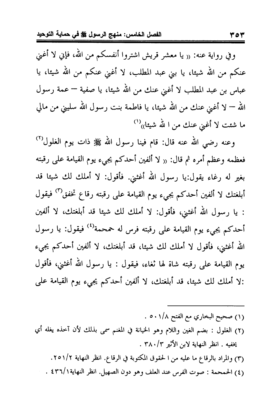وفي رواية عنه: "يا معشر قريش اشتروا أنفسكم من الله، فإني لا أغني عنكم من الله شيئا، يا بني عبد المطلب، لا أغني عنكم من الله شيئا، يا عباس بن عبد المطلب لا أغني عنك من الله شيئا، يا صفية – عمة رسول الله – لا أغني عنك من الله شيئا، يا فاطمة بنت رسول الله سليني من مالي ما شئت لا أغني عنك من الله شيئا" 1.