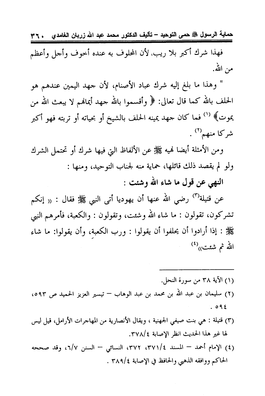 "وهذا ما بلغ إليه شرك عباد الأصنام، لأن جهد اليمين عندهم هو الحلف بالله كما قال تعالى: {وَأَقْسَمُوا بِاللَّهِ جَهْدَ أَيْمَانِهِمْ لا يَبْعَثُ اللَّهُ مَنْ يَمُوتُ} 1 فما كان جهد يمينه الحلف بالشيخ أو بحياته أو تربته فهو أكبر شركا منهم2.