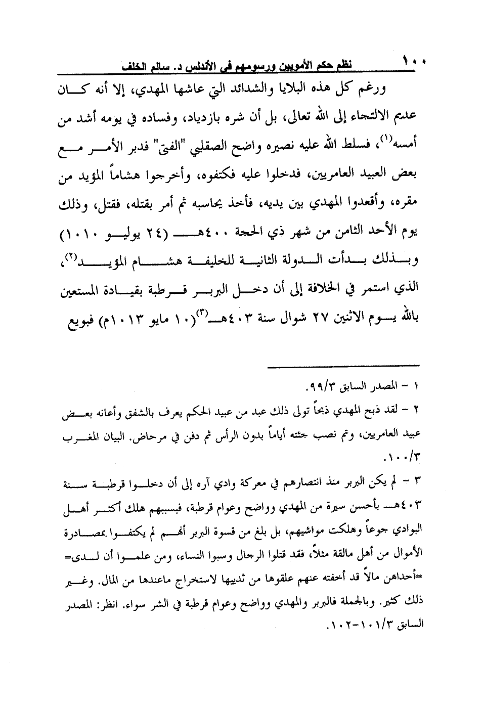 3- لم يكن البربر منذ انتصارهم في معركة وادي آره إلى أن دخلوا قرطبة سنة 403هـ بأحسن سيرة من المهدي وواضح وعوام قرطبة، فبسببهم هلك أكثر أهل البوادي جوعاً وهلكت مواشيهم، بل بلغ من قسوة البربر أنهم لم يكتفوا بمصادرة الأموال من أهل مالقة مثلاً، فقد قتلوا الرجال وسبوا النساء، ومن علموا أن لدى أحداهن مالاً قد أخفته عنهم علقوها من ثدييها لاستخراج ما عندها من المال. وغير ذلك كثير. وبالجملة فالبربر والمهدي وواضح وعوام قرطبة في الشر سواء. انظر: المصدر السابق 3/101-102.
