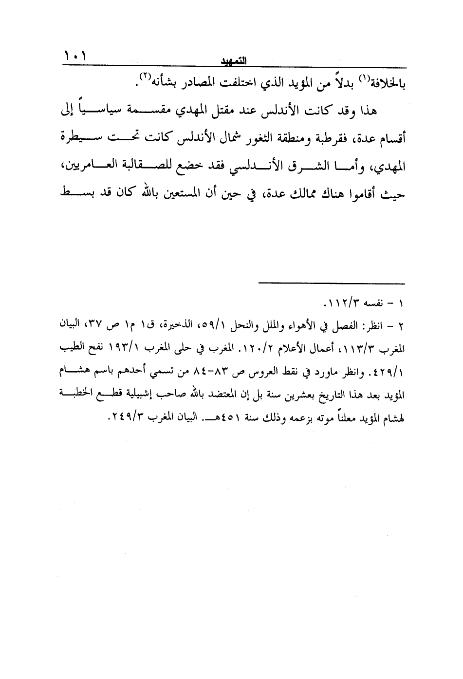2- انظر: الفصل في الأهواء والملل والنحل 1/59، الذخيرة، ق1 م1 ص 37، البيان المغرب 3/113، أعمال الأعلام 2/120. المغرب في حلى المغرب 1/193 نفح الطيب 1/429. وانظر ما ورد في نقط العروس ص 83-84 من تسمي أحدهم باسم هشام المؤيد بعد هذا التاريخ بعشرين سنة بل إن المعتضد بالله صاحب إشبيلية قطع الخطبة لهشام المؤيد معلناً موته بزعمه وذلك سنة 451هـ. البيان المغرب 3/249.
