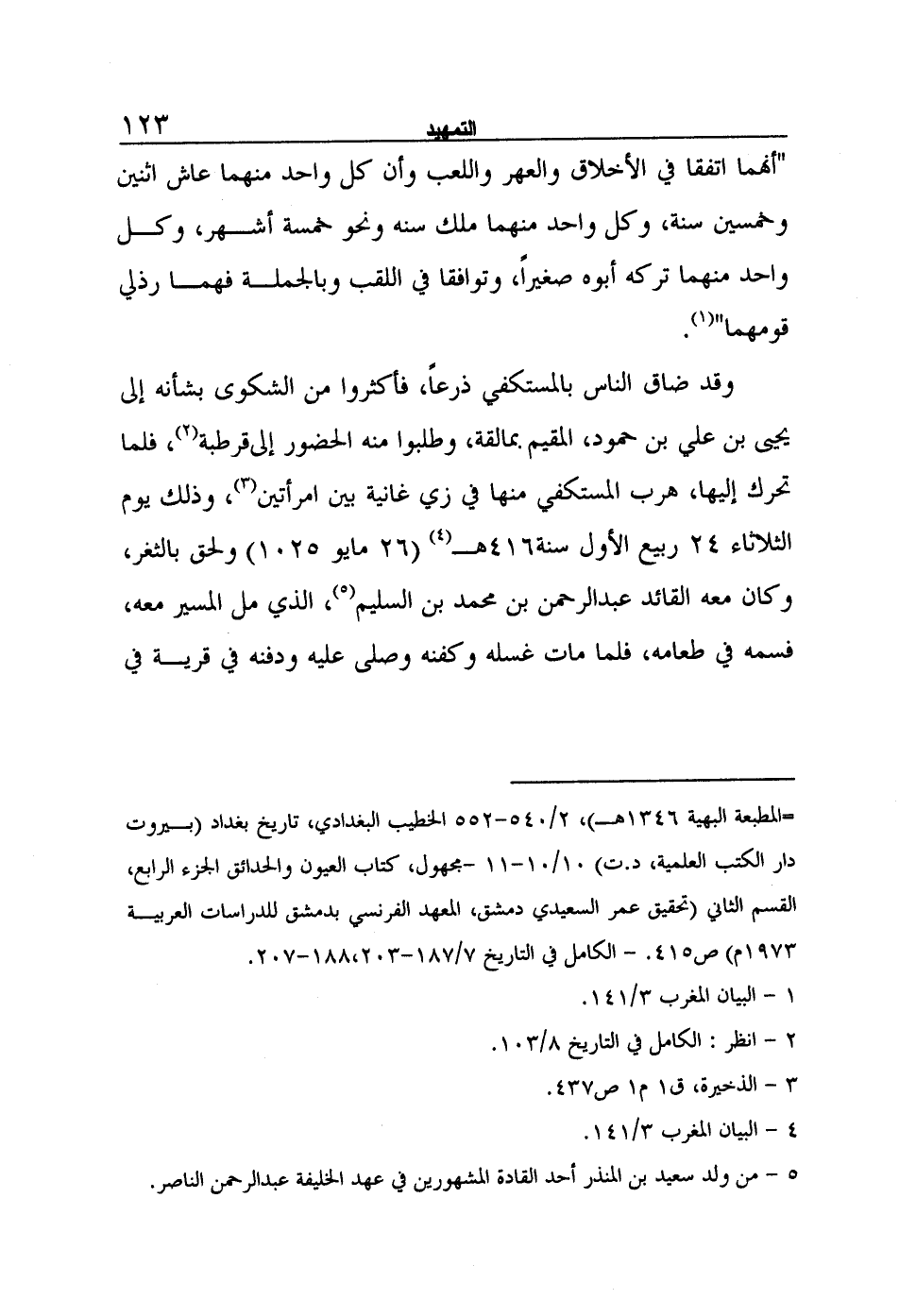 وقد ضاق الناس بالمستكفي ذرعاً، فأكثروا من الشكوى بشأنه إلى يحيى بن علي بن حمود، المقيم بمالقة، وطلبوا منه الحضور إلىقرطبة2، فلما تحرك إليها، هرب المستكفي منها في زي غانية بين امرأتين3، وذلك يوم الثلاثاء 24 ربيع الأول سنة416هـ4 (26 مايو 1025) ولحق بالثغر، وكان معه القائد عبد الرحمن بن محمد بن السليم5، الذي مل المسير معه، فسمه في طعامه، فلما مات غسله وكفنه وصلى عليه ودفنه في قرية في