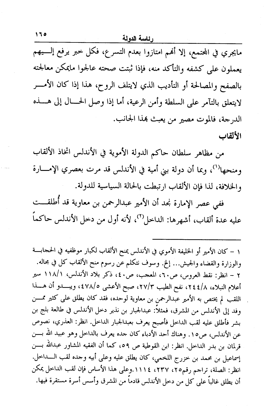 2- انظر: نقط العروس، ص60، المعجب، ص40، ذكر بلاد الأندلس، 1/118 سير أعلام النبلاء، 8/244، نفح الطيب 3/27، صبح الأعشى 5/478، ويبدو أن هذا اللقب لم يختص به الأمير عبد الرحمن بن معاوية لوحده، فقد كان يطلق على كثير ممن وفد إلى الأندلس من المشرق، فمثلاً: عبد الجبار بن نذير دخل الأندلس في طالعة بلج بن بشر فأطلق عليه لقب الداخل فأصبح يعرف بعبد الجبار الداخل. انظر: العذري، نصوص عن الأندلس، ص15. وهناك أحد الأدباء كان جده يعرف بالداخل وهو عبيد الله بن قرلمان بن بدر الداخل. انظر: ابن القوطية ص 59، كما أن الفقيه المشاور عبد الله بن إسماعيل بن محمد بن خزرج اللخمي، كان يطلق عليه وعلى أبيه وجده لقب الداخل. انظر: الصلة، تراجم رقم25، 237، 1114.وعلى هذا الأساس فإن لقب الداخل يمكن أن يطلق غالباً على كل من دخل الأندلس قادماً من المشرق وأسس أسرة مستقرة فيها.