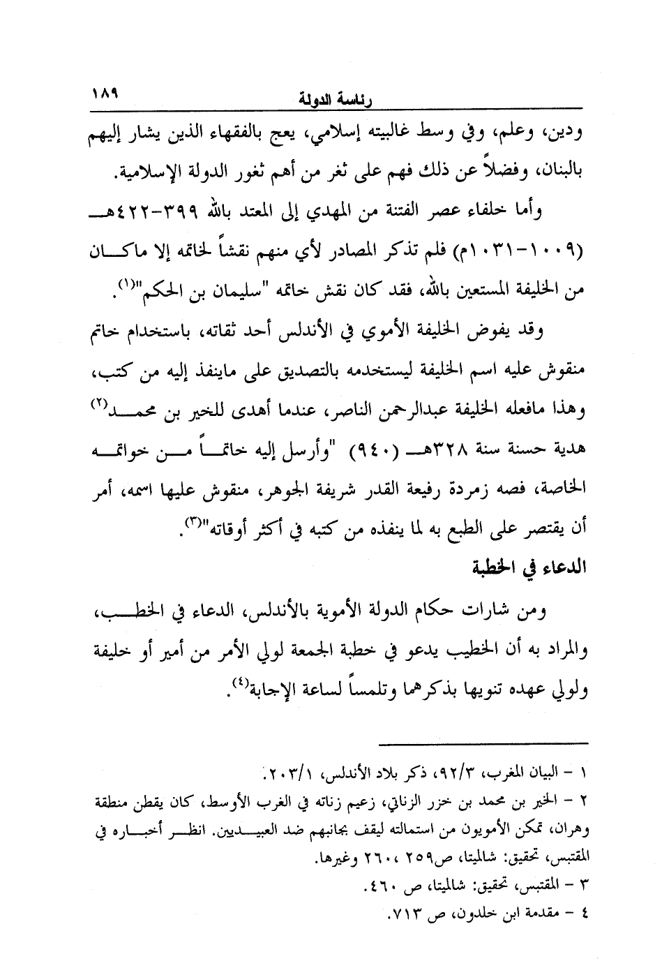 ومن شارات حكام الدولة الأموية بالأندلس، الدعاء في الخطب، والمراد به أن الخطيب يدعو في خطبة الجمعة لولي الأمر من أمير أو خليفة ولولي عهده تنويها بذكرهما وتلمساً لساعة الإجابة 4.