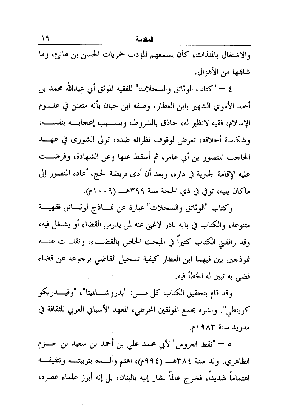 4- "كتاب الوثائق والسجلات" للفقيه الموثق أبي عبد الله محمد بن أحمد الأموي الشهير بابن العطار، وصفه ابن حيان بأنه متفنن في علوم الإسلام، فقيه لا نظير له، حاذق بالشروط، وبسبب إعجابه بنفسه، وشكاسة أخلاقه، تعرض لوقوف نظرائه ضده، تولى الشورى في عهد الحاجب المنصور بن أبي عامر، ثم أسقط عنها وعن الشهادة، وفرضت عليه الإقامة الجبرية في داره، وبعد أن أدى فريضة الحج، أعاده المنصور إلى ما كان يليه، توفي في ذي الحجة سنة 399هـ (1009م) .
