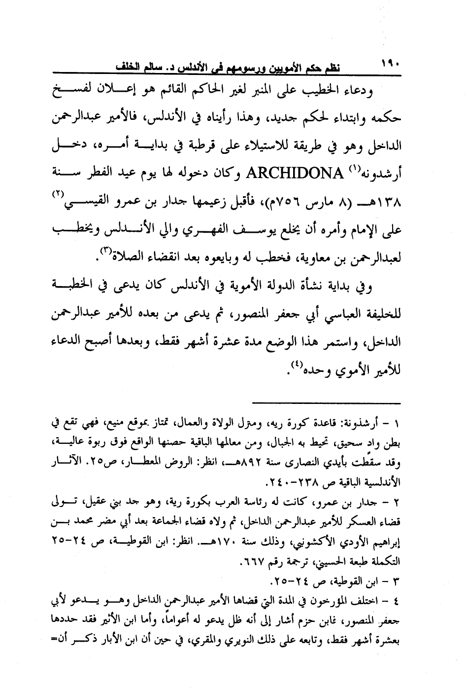 4- اختلف المؤرخون في المدة التي قضاها الأمير عبد الرحمن الداخل وهو يدعو لأبي جعفر المنصور، فابن حزم أشار إلى أنه ظل يدعو له أعواماً، وأما ابن الأثير فقد حددها بعشرة أشهر فقط، وتابعه على ذلك النويري والمقري، في حين أن ابن الأبار ذكر أن= =المدة دون السنة، وأما ابن الكردبوس فقد ذكر أن جميع أمراء بني أمية كانوا يخطبون للعباسيين، وتابعه على ذلك ابن أبي دينار، وأما صاحب ذكر بلاد الأندلس فقد ذكر أن الدعوة استمرت لأبي جعفر المنصور مدة سنتين، في حين أن ابن خلدون لم يحدد المدة. انظر على التوالي: نقط العروس ص75. الكامل 5/209. نهاية الأرب 23/346. نفح الطيب 3/59، الحلة السيراء 1/35-36. تاريخ الأندلس لابن الكردبوس ص60-61. ابن أبي دينار، المؤنس في أخبار أفريقيا وتونس، (تحقيق وتعليه: محمد شمام، المكتبة العتيقة، تونس 1387هـ) ، ص 100. ذكر بلاد الأندلس 1/114. تاريخ ابن خلدون 4/122. ومن خلال هذه الأقوال نرى أن المدة التي قضاها الداخل في الدعاء للمنصور هي عشرة أشهر فقط، كما ذهب إلى ذلك ابن الأثير ومن تابعه، ويمكن الاستئناس بتاريخ مولد هشام بن الداخل، على المدة التي استمر فيها الدعاء للمنصور، فقد ورد في البيان المغرب (2/48) أن الأمير الداخل بعد قطع الدعاء للمنصور ولد ابنه هشام لأربع خلون من شوال سنة 139هـ، وإذا ما أجرينا عملية حسابية من يوم الأضحى سنة 138هـ إلى مولد هشام نجد المدة لا تتجاوز عشرة أشهر.