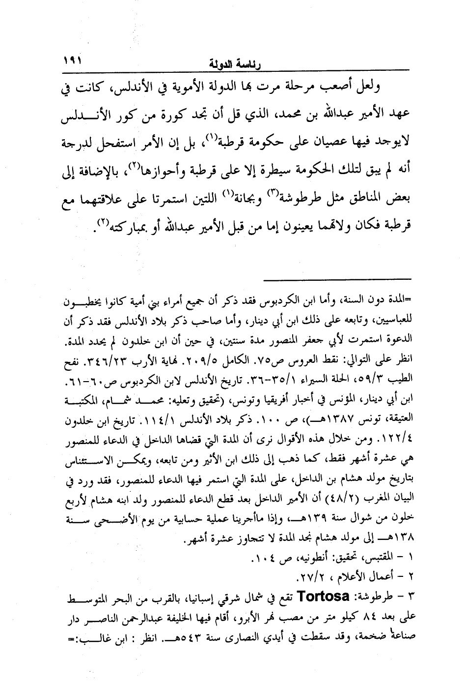 3- طرطوشة: Tortosa تقع في شمال شرقي إسبانيا، بالقرب من البحر المتوسط على بعد 84 كيلو متر من مصب نهر الأبرو، أقام فيها الخليفة عبد الرحمن الناصر دار صناعة ضخمة، وقد سقطت في أيدي النصارى سنة 543هـ. انظر: ابن غالب: تعليق منتقى ص 285-286 الروض المعطار ص391-392. الحلل السندسية، 3/7-44. الآثار الأندلسية الباقية، ص120-122.