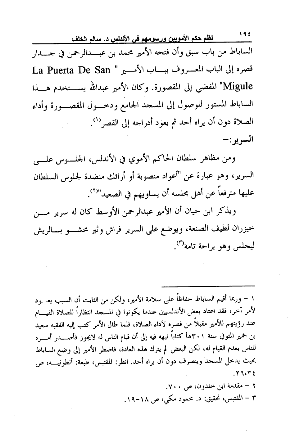 1- وربما أقيم الساباط حفاظاً على سلامة الأمير، ولكن من الثابت أن السبب يعود لأمر آخر، فقد اعتاد بعض الأندلسيين عندما يكونوا في المسجد انتظاراً للصلاة القيام عند رؤيتهم للأمير مقبلاً من قصره لأداء الصلاة، فلما طال الأمر كتب إليه الفقيه سعيد بن خمير المتوفي سنة 301هـ كتاباً نبهه فيه إلى أن قيام الناس له لا يجوز فأصدر أمره للناس بعدم القيام له، لكن البعض لم يترك هذه العادة، فاضطر الأمير إلى وضع الساباط بحيث يدخل المسجد وينصرف دون أن يراه أحد. انظر: المقتبس، طبعة: أنطونيه، ص 26،34.