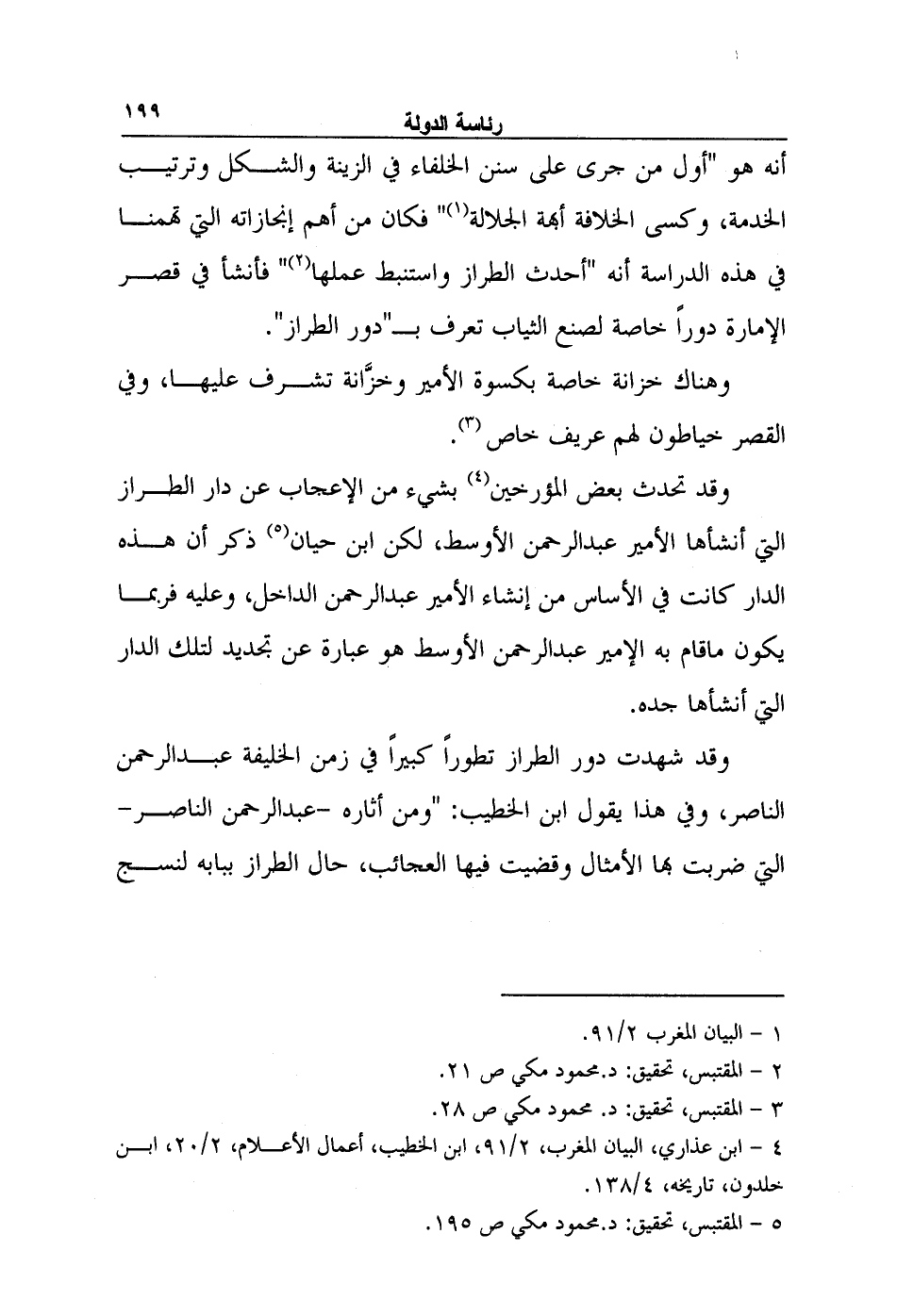 أنه هو "أول من جرى على سنن الخلفاء في الزينة والشكل وترتيب الخدمة، وكسى الخلافة أبهة الجلالة 1 " فكان من أهم إنجازاته التي تهمنا في هذه الدراسة أنه "أحدث الطراز واستنبط عملها 2 " فأنشأ في قصر الإمارة دوراً خاصة لصنع الثياب تعرف بـ"دور الطراز".