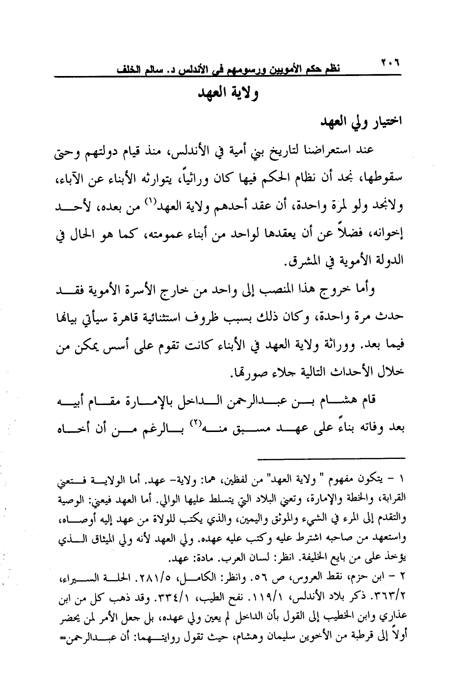 2- ابن حزم، نقط العروس، ص 56. وانظر: الكامل، 5/281. الحلة السيراء، 2/363. ذكر بلاد الأندلس، 1/119. نفح الطيب، 1/334. وقد ذهب كل من ابن عذاري وابن الخطيب إلى القول بأن الداخل لم يعين ولي عهده، بل جعل الأمر لمن يحضر أولاً إلى قرطبة من الأخوين سليمان وهشام، حيث تقول روايتهما: أن عبد الرحمن الداخل أوصى ابنه عبد الله قائلاً: "من سبق إليك من أخويك فارم إليه بالخاتم والأمر، فإن سبق إليك هشام فله فضل دينه وعفافه واجتماع الكلمة، وإن سبق إليك سليمان فله فضل سنه وبخدته وحب الشاميين له. انظر البيان المغرب، 2/61. أعمال الأعلام: 2/11. ووفق النص السابق نجد أن الداخل جعل الأمر لمن سبق من الأخوين، فهل يعقل أن يترك الداخل أمر الدولة من بعده دون أن يقطع فيه برأيه، وإذا كان الوضع بهذه الصورة فلم لم يعمد عبد الله إلى أخذ الأمر لنفسه بعد أخذ الاحتياطات اللازمة؟.