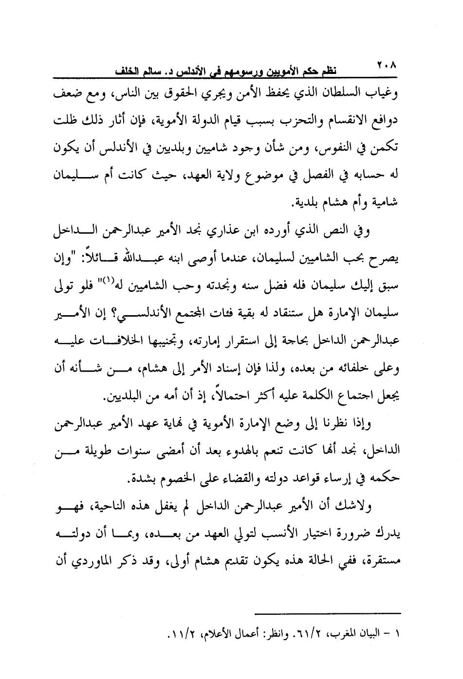 وفي النص الذي أورده ابن عذاري نجد الأمير عبد الرحمن الداخل يصرح بحب الشاميين لسليمان، عندما أوصى ابنه عبد الله قائلاً: "وإن سبق إليك سليمان فله فضل سنه ونجدته وحب الشاميين له1" فلو تولى سليمان الإمارة هل ستنقاد له بقية فئات المجتمع الأندلسي؟ إن الأمير عبد الرحمن الداخل بحاجة إلى استقرار إمارته، وتجنيبها الخلافات عليه وعلى خلفائه من بعده، ولذا فإن إسناد الأمر إلى هشام، من شأنه أن يجعل اجتماع الكلمة عليه أكثر احتمالاً، إذ أن أمه من البلديين.