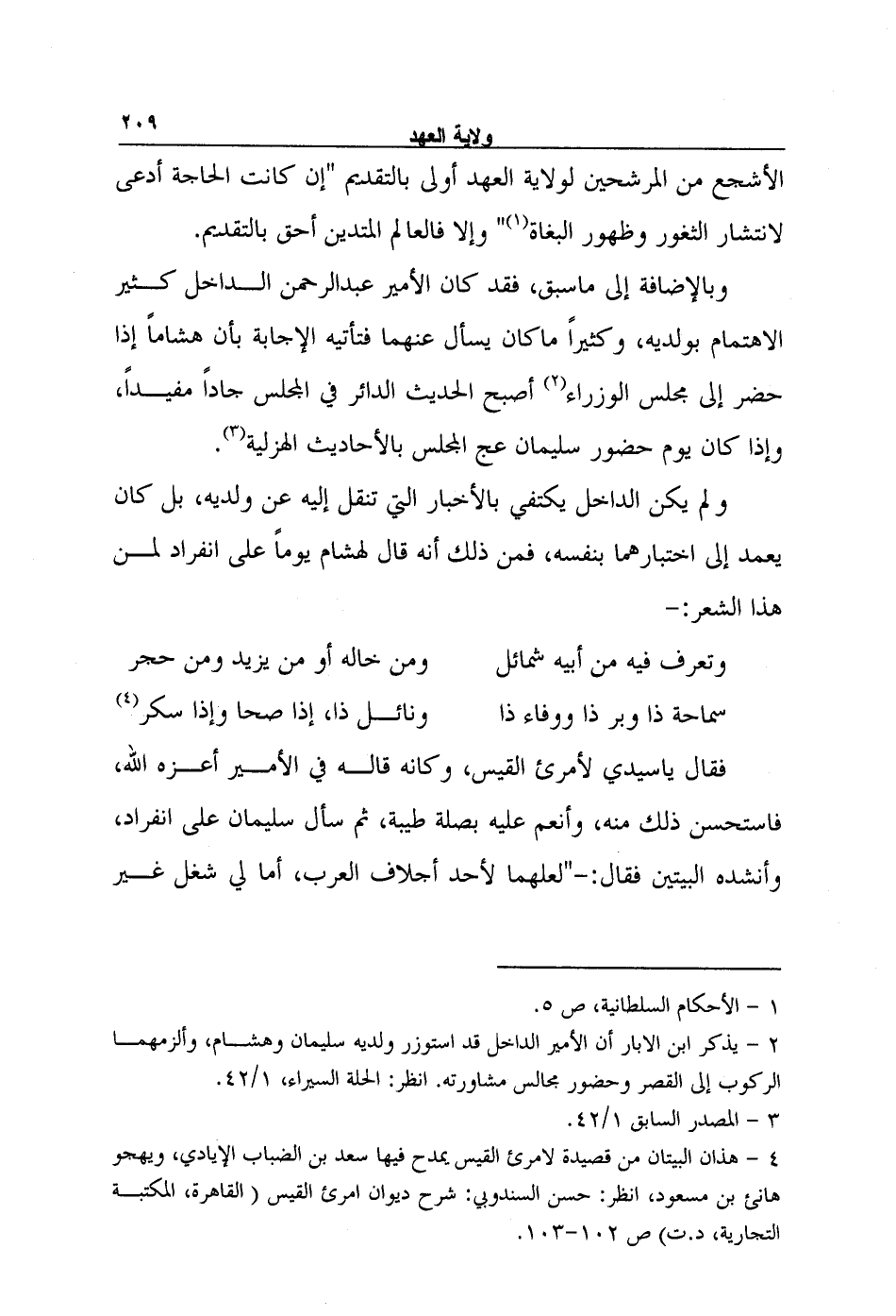وبالإضافة إلى ما سبق، فقد كان الأمير عبد الرحمن الداخل كثير الاهتمام بولديه، وكثيراً ماكان يسأل عنهما فتأتيه الإجابة بأن هشاماً إذا حضر إلى مجلس الوزراء2 أصبح الحديث الدائر في المجلس جاداً مفيداً، وإذا كان يوم حضور سليمان عج المجلس بالأحاديث الهزلية3.