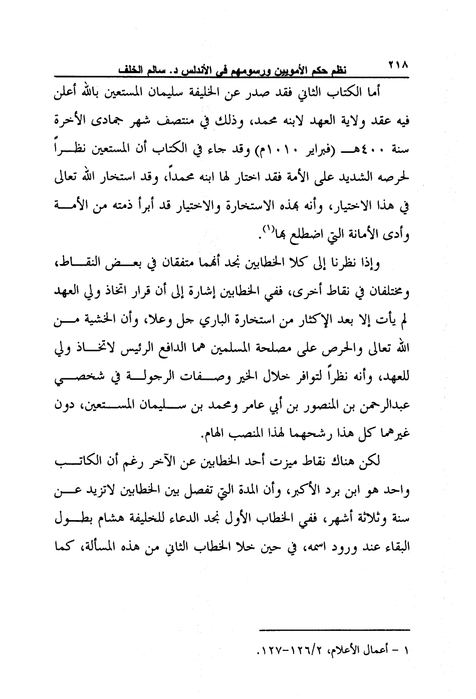 أما الكتاب الثاني فقد صدر عن الخليفة سليمان المستعين بالله أعلن فيه عقد ولاية العهد لابنه محمد، وذلك في منتصف شهر جمادى الآخرة سنة 400هـ (فبراير 1010م) وقد جاء في الكتاب أن المستعين نظراً لحرصه الشديد على الأمة فقد اختار لها ابنه محمداً، وقد استخار الله تعالى في هذا الاختيار، وأنه بهذه الاستخارة والاختيار قد أبرأ ذمته من الأمة وأدى الأمانة التي اضطلع بها1.