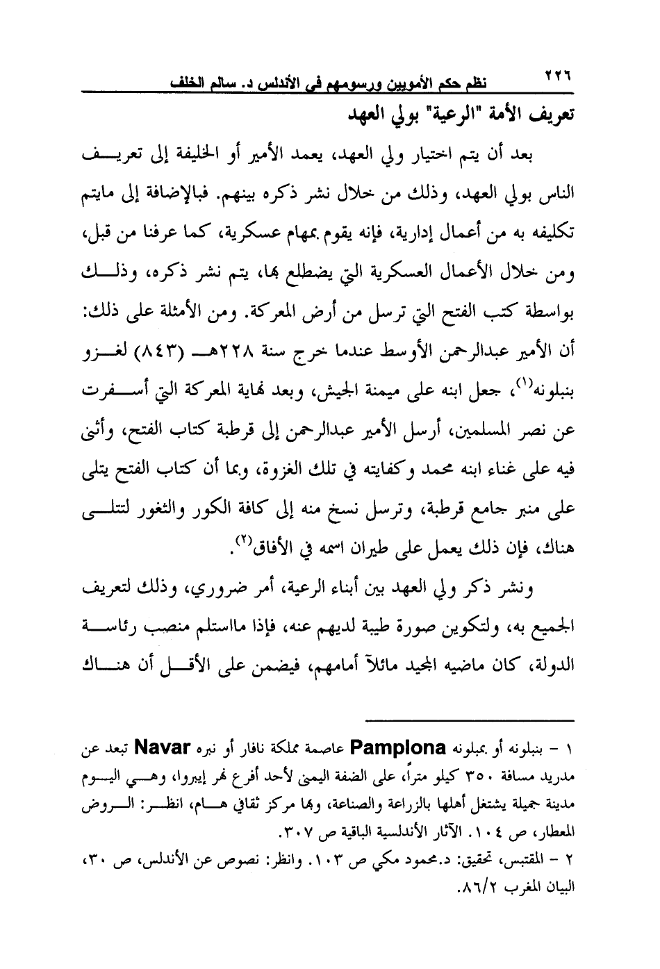 1- بنبلونه أو بمبلونه Pamplona عاصمة مملكة نافار أو نبره Navar تبعد عن مدريد مسافة 350 كيلو متراً، على الضفة اليمنى لأحد أفرع نهر إيبروا، وهي اليوم مدينة جميلة يشتغل أهلها بالزراعة والصناعة، وبها مركز ثقافي هام، انظر: الروض المعطار، ص 104. الآثار الأندلسية الباقية ص 307.