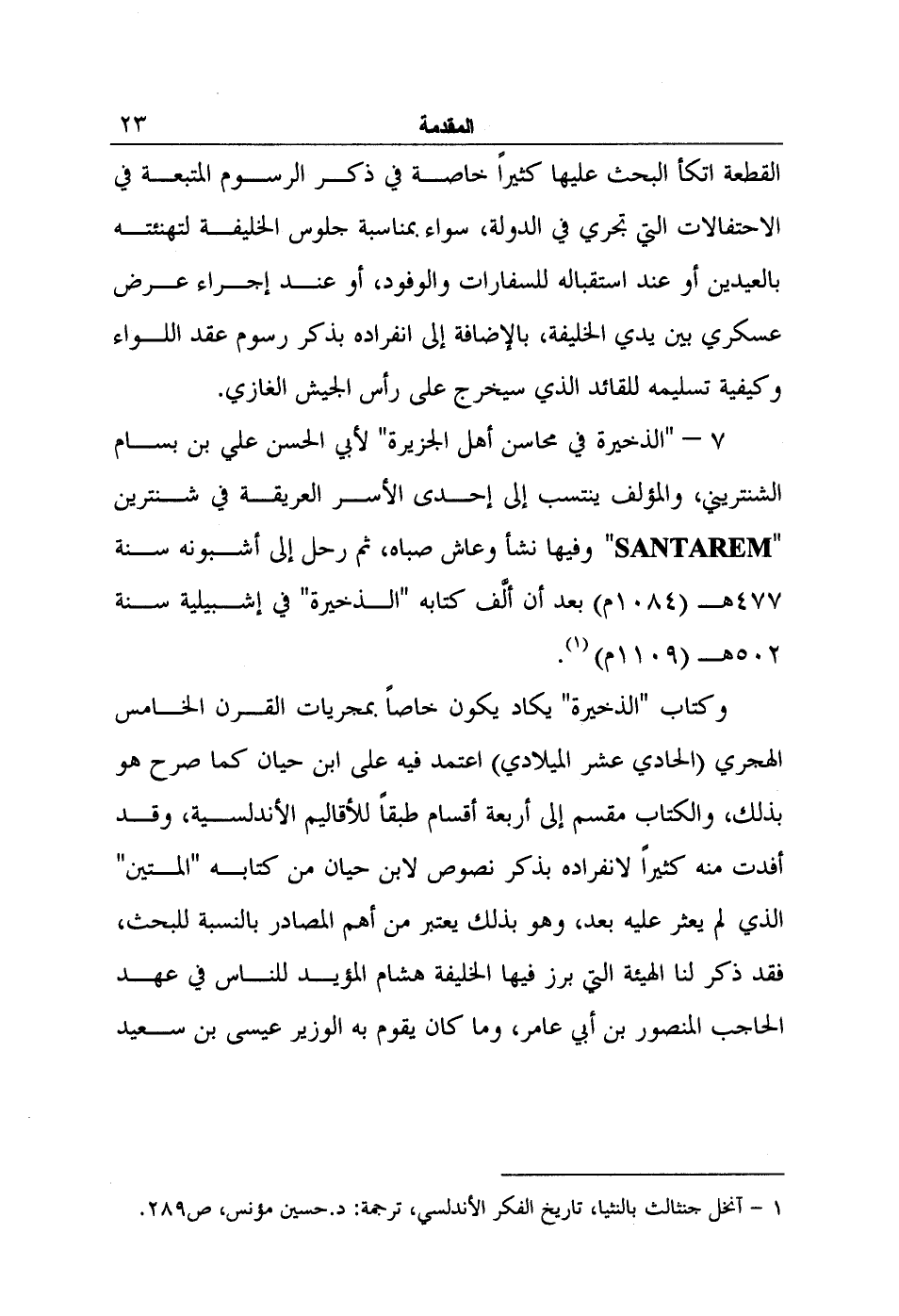 7- "الذخيرة في محاسن أهل الجزيرة" لأبي الحسن علي بن بسام الشنتريني، والمؤلف ينتسب إلى إحدى الأسر العريقة في شنترين "SANTAREM" وفيها نشأ وعاش صباه، ثم رحل إلى أشبونه سنة 477هـ (1084م) بعد أن ألَّف كتابه "الذخيرة" في إشبيلية سنة 502هـ (1109م) 1.