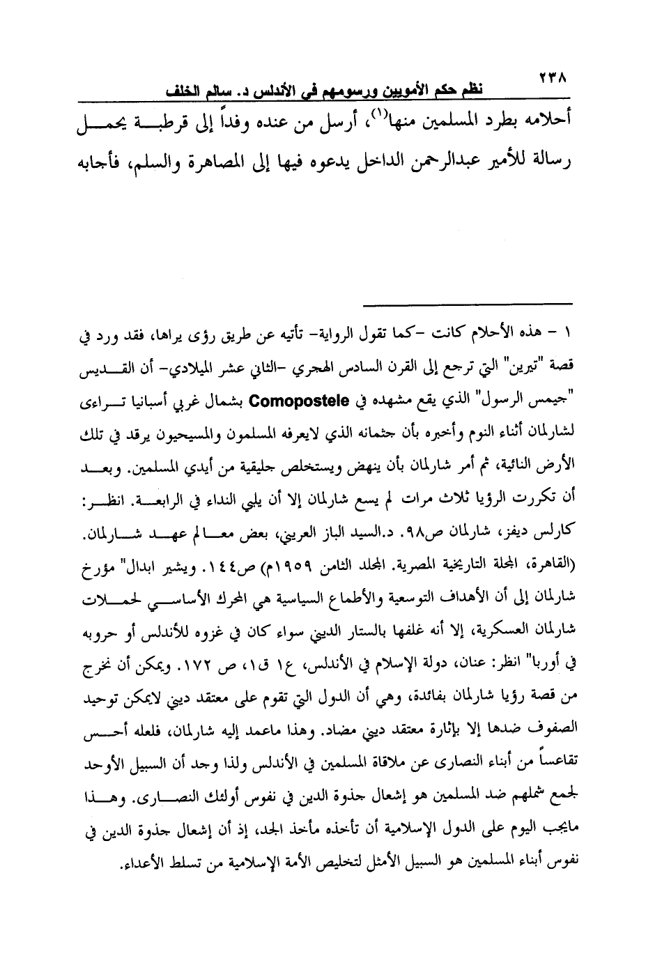 1- هذه الأحلام كانت-كما تقول الرواية- تأتيه عن طريق رؤى يراها، فقد ورد في قصة "تيرين" التي ترجع إلى القرن السادس الهجري-الثاني عشر الميلادي- أن القديس "جيمس الرسول" الذي يقع مشهده في Comopostele بشمال غربي أسبانيا تراءى لشارلمان أثناء النوم وأخبره بأن جثمانه الذي لا يعرفه المسلمون والمسيحيون يرقد في تلك الأرض النائية، ثم أمر شارلمان بأن ينهض ويستخلص جليقية من أيدي المسلمين. وبعد أن تكررت الرؤيا ثلاث مرات لم يسع شارلمان إلا أن يلبي النداء في الرابعة. انظر: كارلس ديفز، شارلمان ص98. د. السيد الباز العريني، بعض معالم عهد شارلمان. (القاهرة، المجلة التاريخية المصرية. المجلد الثامن 1959م) ص144. ويشير ابدال مؤرخ شارلمان "إلى أن الأهداف التوسعية والأطماع السياسية هي المحرك الأساسي لحملات شارلمان العسكرية، إلا أنه غلفها بالستار الديني سواء كان في غزوه للأندلس أو حروبه في أوربا" انظر: عنان، دولة الإسلام في الأندلس، ع1 ق1، ص 172. ويمكن أن نخرج من قصة رؤيا شارلمان بفائدة، وهي أن الدول التي تقوم على معتقد ديني لا يمكن توحيد الصفوف ضدها إلا بإثارة معتقد ديني مضاد. وهذا ما عمد إليه شارلمان، فلعله أحس تقاعساً من أبناء النصارى عن ملاقاة المسلمين في الأندلس ولذا وجد أن السبيل الأوحد لجمع شملهم ضد المسلمين هو إشعال جذوة الدين في نفوس أولئك النصارى. وهذا ما يجب اليوم على الدول الإسلامية أن تأخذه مأخذ الجد، إذ أن إشعال جذوة الدين في نفوس أبناء المسلمين هو السبيل الأمثل لتخليص الأمة الإسلامية من تسلط الأعداء.