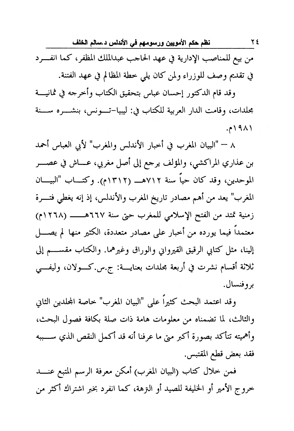 وقد اعتمد البحث كثيراً على "البيان المغرب" خاصة المجلدين الثاني والثالث، لما تضمناه من معلومات هامة ذات صلة بكافة فصول البحث، وأهميته تتأكد بصورة أكبر متى ما عرفنا أنه قد أكمل النقص الذي سببه فقد بعض قطع المقتبس.
