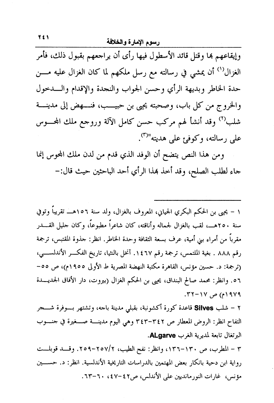 وإيقاعهم بها وقتل قائد الأسطول فيها رأى أن يراجعهم بقبول ذلك، فأمر الغزال1 أن يمشي في رسالته مع رسل ملكهم لما كان الغزال عليه من حدة الخاطر وبديهة الرأي وحسن الجواب والنجدة والإقدام والدخول والخروج من كل باب، وصحبته يحيى بن حبيب، فنهض إلى مدينة شلب2 وقد أنشأ لهم مركب حسن كامل الآلة وروجع ملك المجوس على رسالته، وكوفئ على هديته"3.