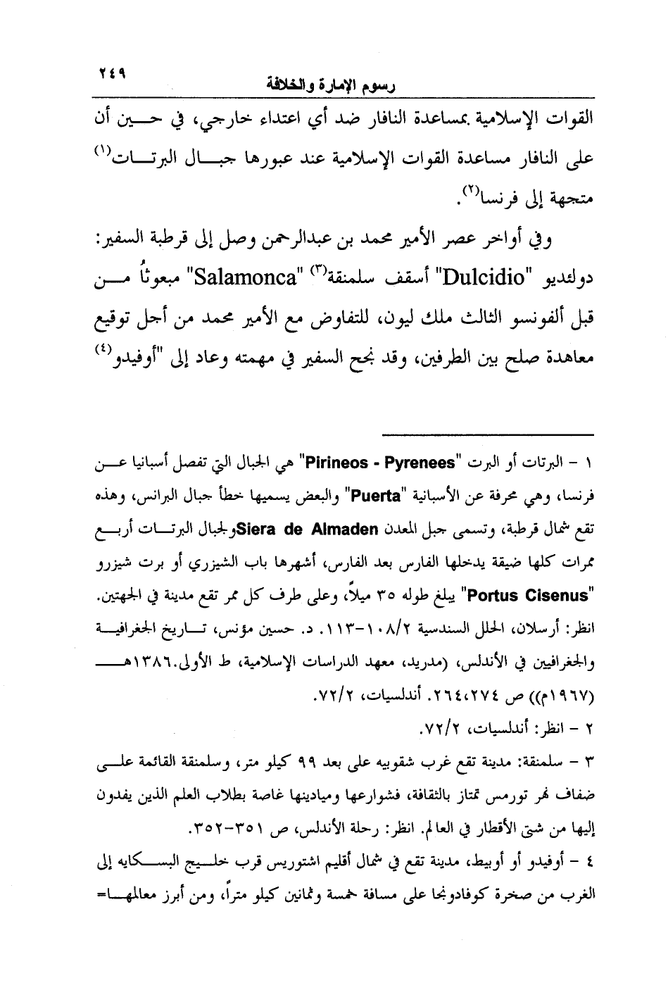 1- البرتات أو البرت "Pirineos- Pyrenees" هي الجبال التي تفصل أسبانيا عن فرنسا، وهي محرفة عن الأسبانية "Puerta" والبعض يسميها خطأ جبال البرانس، وهذه تقع شمال قرطبة، وتسمى جبل المعدن Siera de Almadenولجبال البرتات أربع ممرات كلها ضيقة يدخلها الفارس بعد الفارس، أشهرها باب الشيزري أو برت شيزرو "Portus Cisenus" يبلغ طوله 35 ميلاً، وعلى طرف كل ممر تقع مدينة في الجهتين. انظر: أرسلان، الحلل السندسية 2/108-113. د. حسين مؤنس، تاريخ الجغرافية والجغرافيين في الأندلس، (مدريد، معهد الدراسات الإسلامية، ط الأولى.1386هـ (1967م)) ص 264،274. أندلسيات، 2/72.