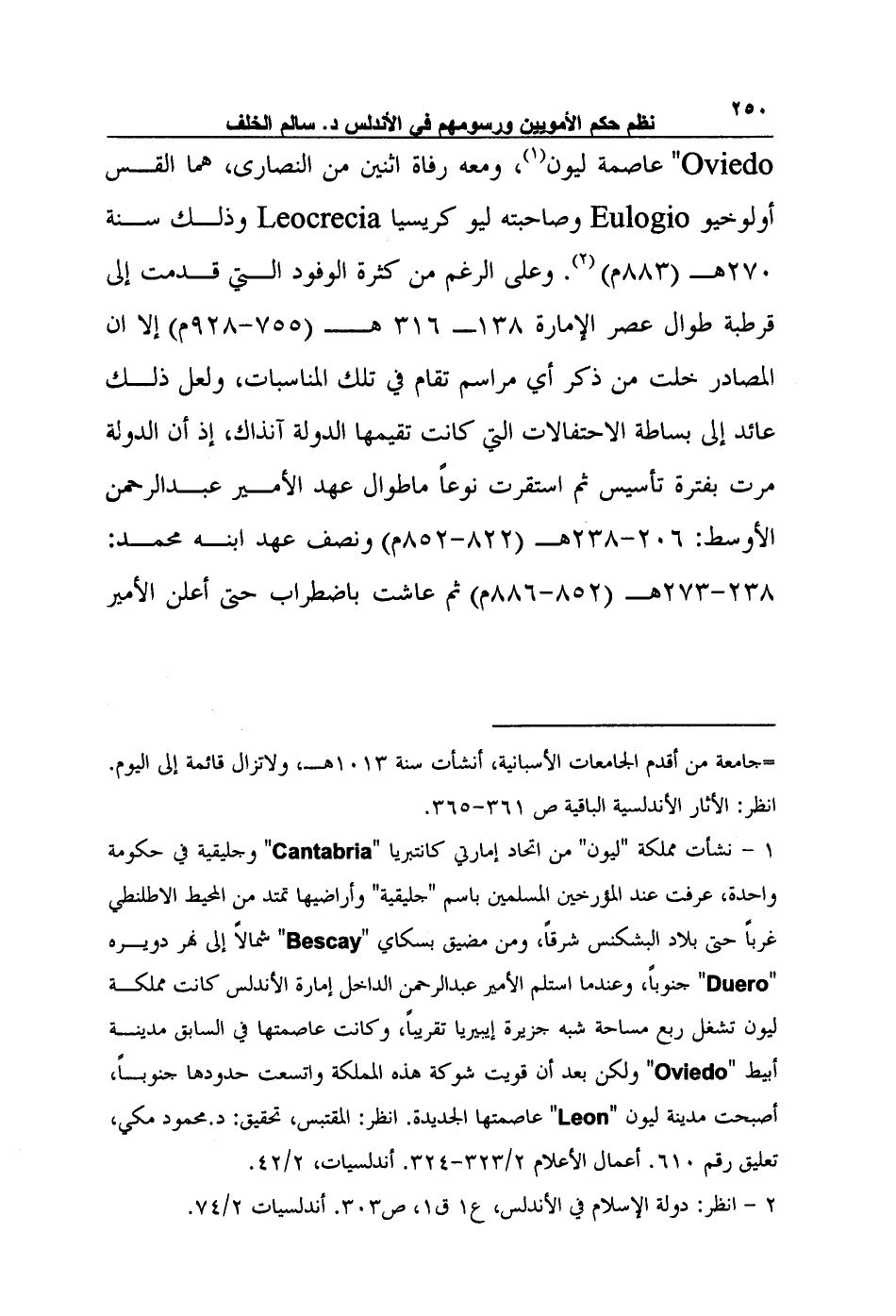 Oviedo" عاصمة ليون1، ومعه رفاة اثنين من النصارى، هما القس أولوخيو Eulogio وصاحبته ليو كريسيا Leocrecia وذلك سنة 270هـ (883م) 2. وعلى الرغم من كثرة الوفود التي قدمت إلى قرطبة طوال عصر الإمارة 138ـ 316 هـ (755-928م) إلا ان المصادر خلت من ذكر أي مراسم تقام في تلك المناسبات، ولعل ذلك عائد إلى بساطة الاحتفالات التي كانت تقيمها الدولة آنذاك، إذ أن الدولة مرت بفترة تأسيس ثم استقرت نوعاً ما طوال عهد الأمير عبد الرحمن الأوسط: 206-238هـ (822-852م) ونصف عهد ابنه محمد: 238-273هـ (852-886م) ثم عاشت باضطراب حتى أعلن الأمير